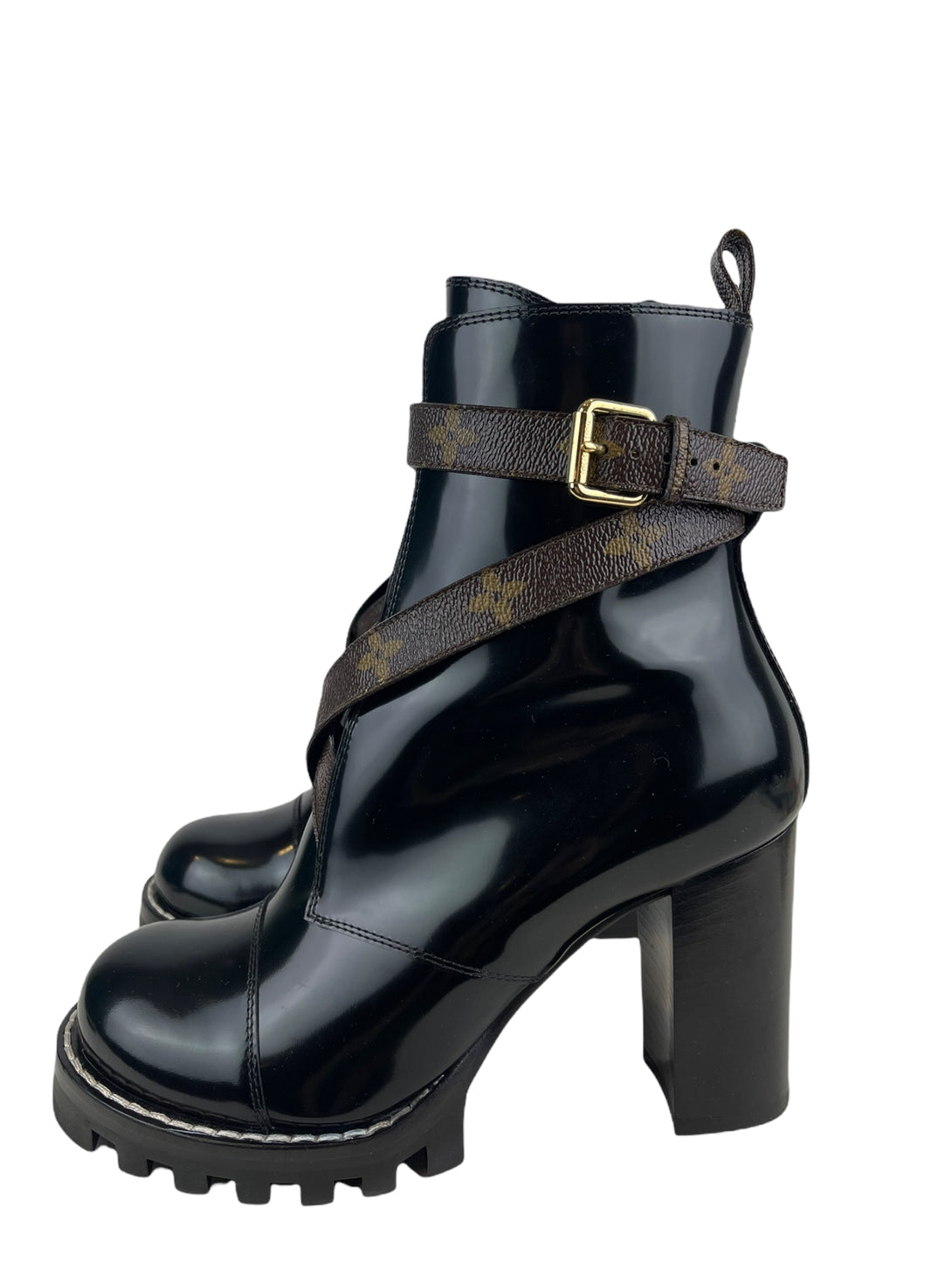 Louis Vuitton Black Patent Boots W/ Monogram Strap - UK 6