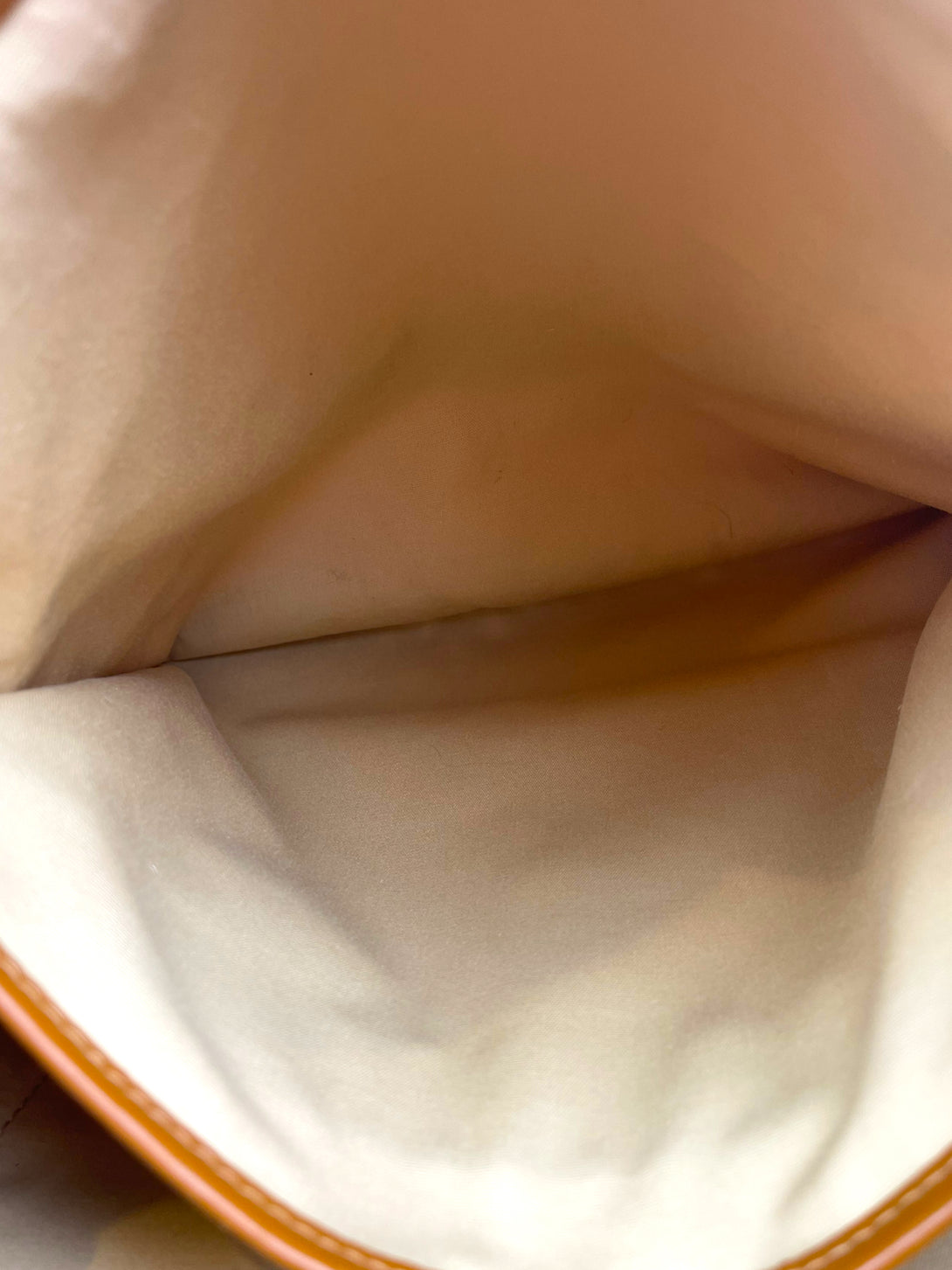 Good: Items show more prominent wear such as noticeable discoloration, stains and snags to fabric. May have worn corners and handles, tarnishing to hardware and creasing to leather. Pen or make up marks may be visible in the interior of the bag.