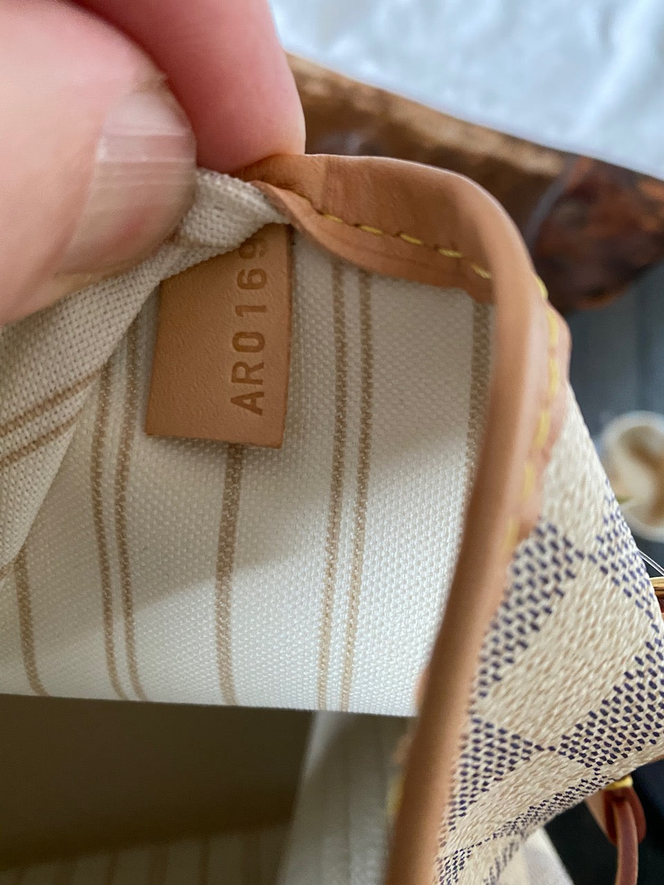 - Signature, Damier Azur Neverfull MM with polished goldtone hardware