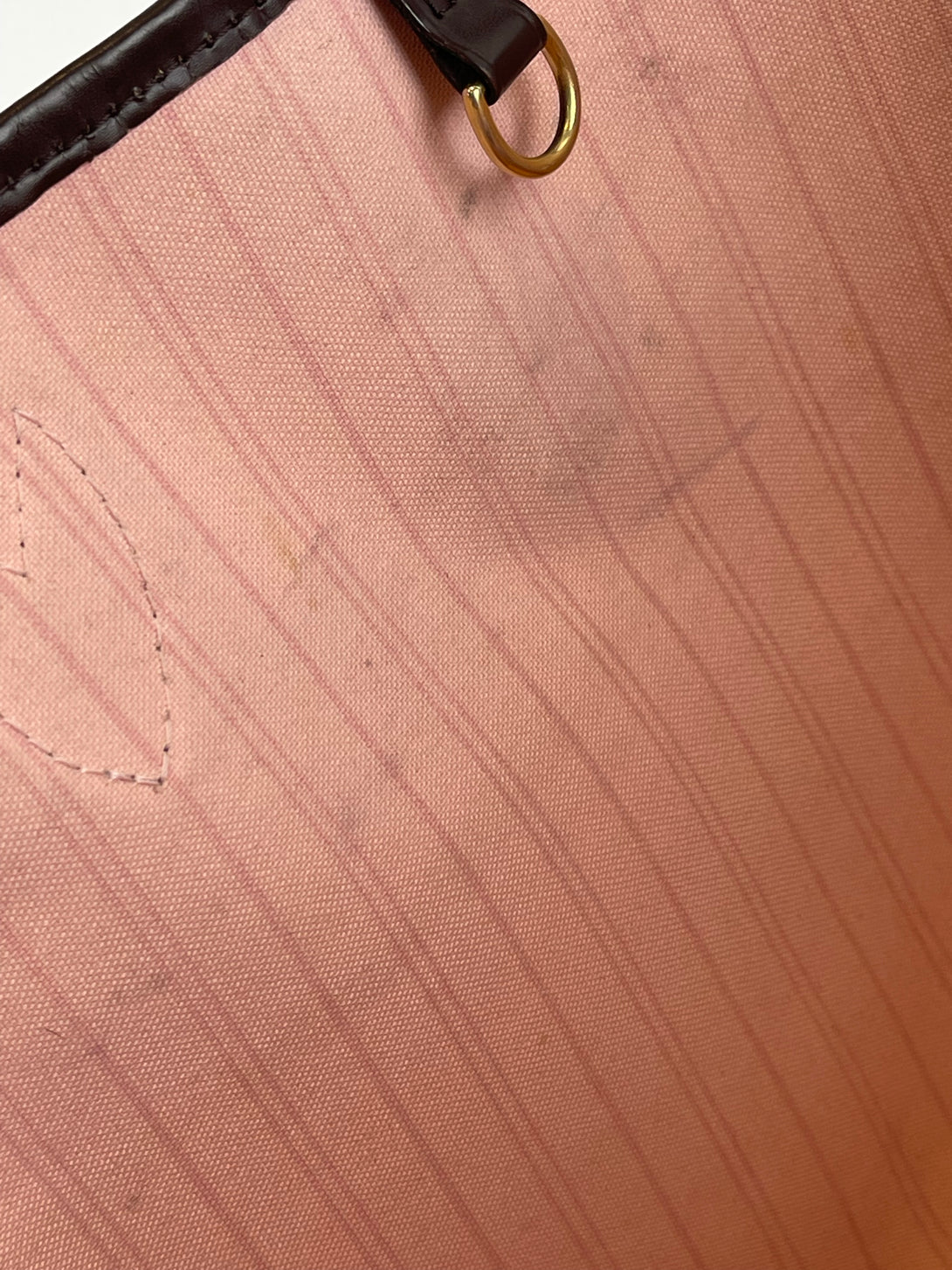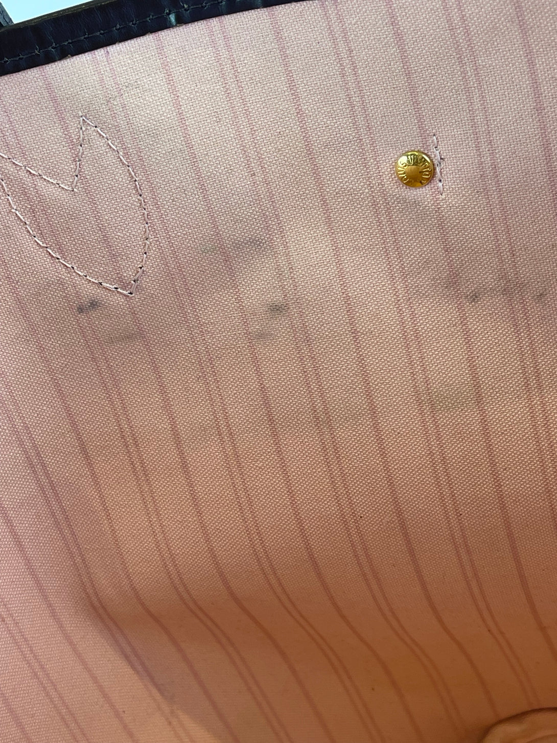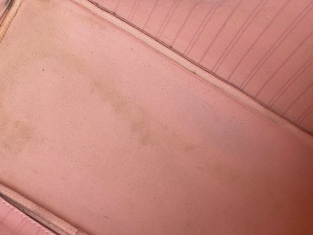 Good: Items show more prominent wear such as noticeable discoloration, stains and snags to fabric. May have worn corners and handles, tarnishing to hardware and creasing to leather. Pen or make up marks may be visible in the interior of the bag.