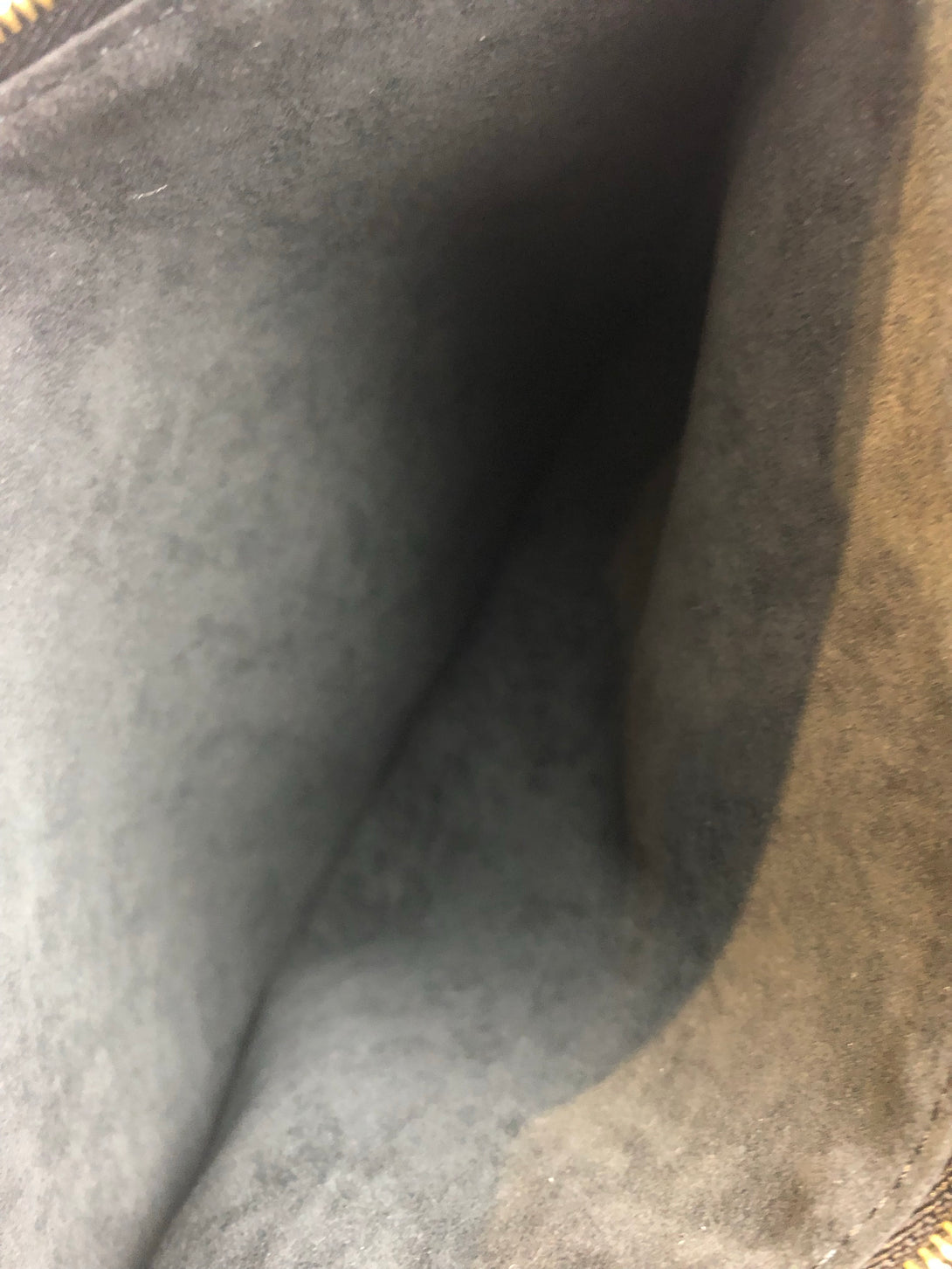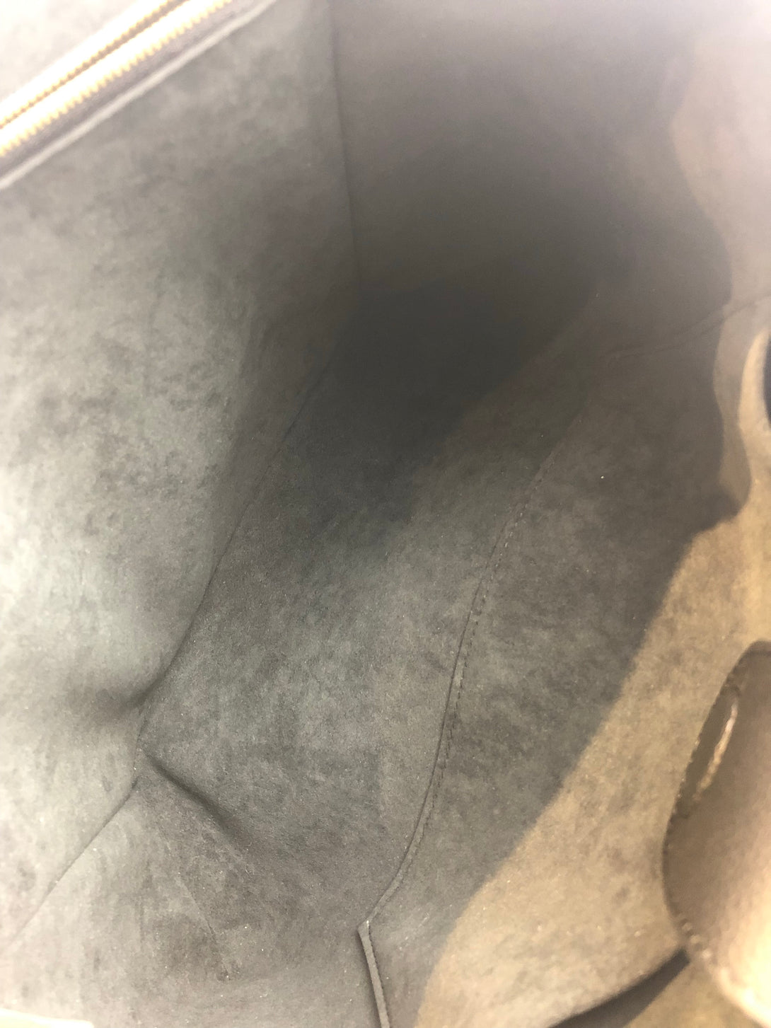 Good: Items show more prominent wear such as noticeable discoloration, stains and snags to fabric. May have worn corners and handles, tarnishing to hardware and creasing to leather. Pen or make up marks may be visible in the interior of the bag.