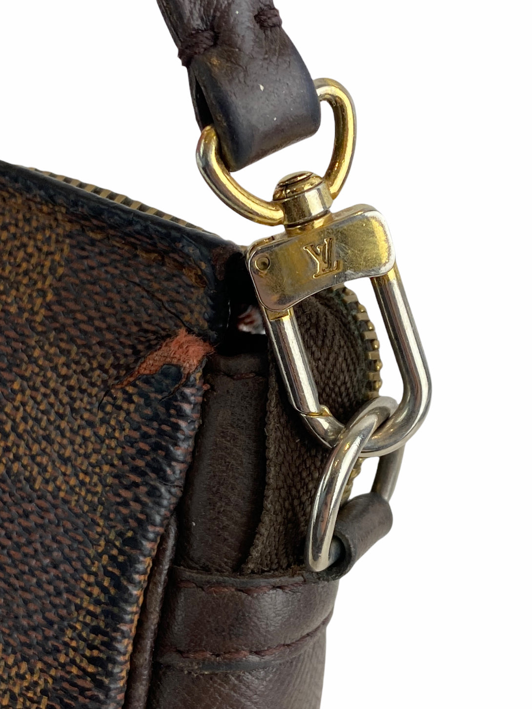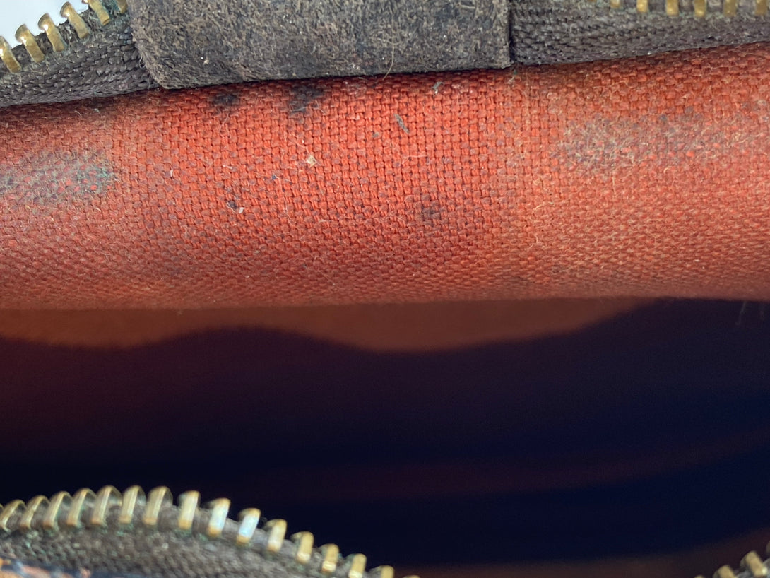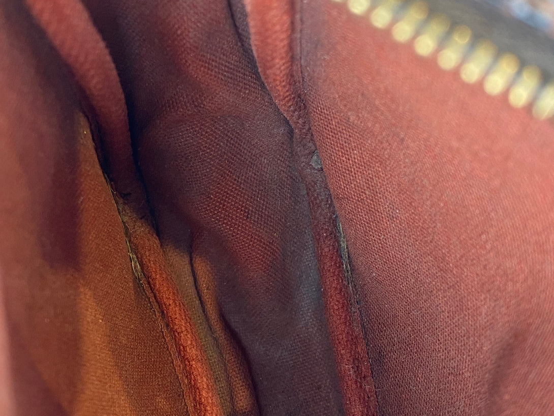 Good: Items show more prominent wear such as noticeable discoloration, stains and snags to fabric. May have worn corners and handles, tarnishing to hardware and creasing to leather. Pen or make up marks may be visible in the interior of the bag.