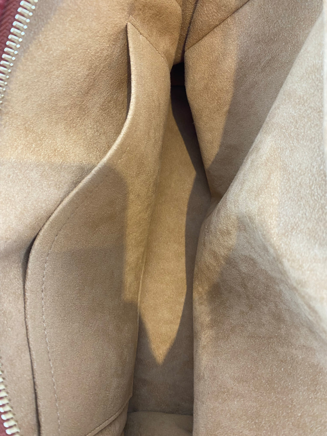 Good: Items show more prominent wear such as noticeable discoloration, stains and snags to fabric. May have worn corners and handles, tarnishing to hardware and creasing to leather. Pen or make up marks may be visible in the interior of the bag.