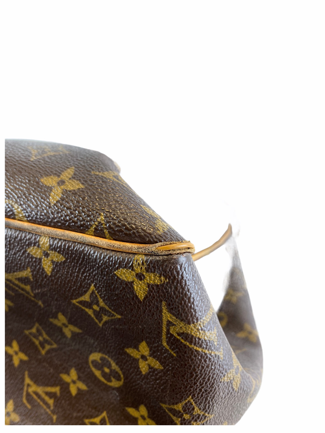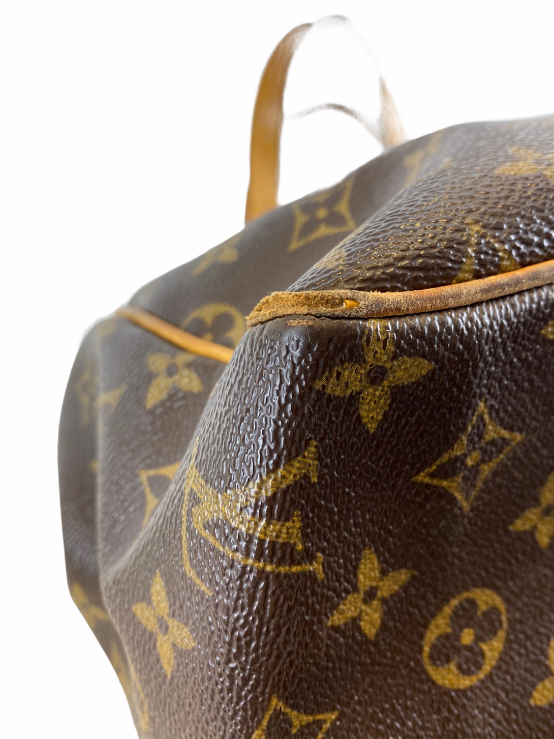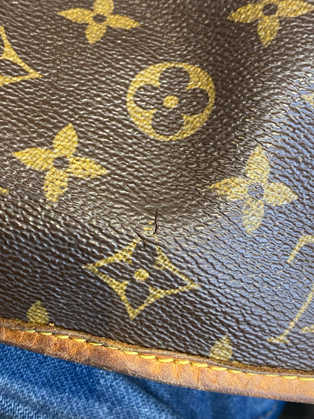 - Overall Condition: Fair Pre-Loved Condition - signs of wear - piping exposed at the corners - "honeying" to the leather - crack in canvas as shown