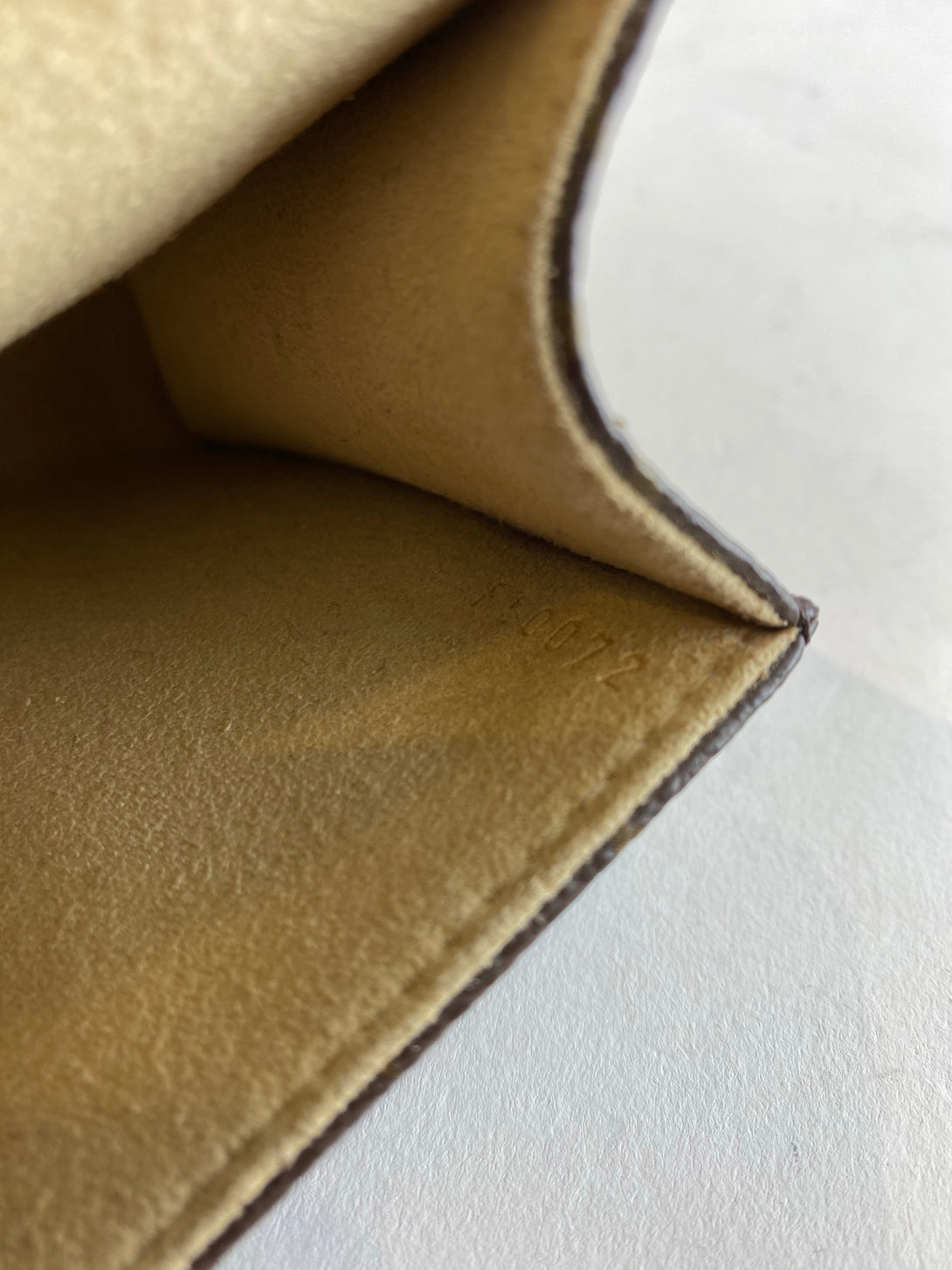 Good: Items show more prominent wear such as noticeable discoloration, stains and snags to fabric. May have worn corners and handles, tarnishing to hardware and creasing to leather. Pen or make up marks may be visible in the interior of the bag.
