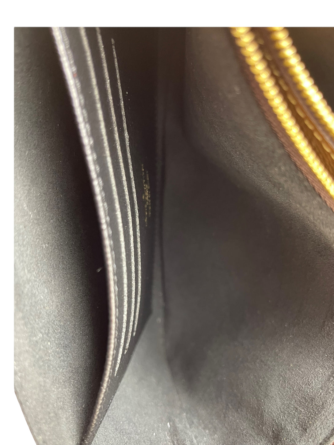Good: Items show more prominent wear such as noticeable discoloration, stains and snags to fabric. May have worn corners and handles, tarnishing to hardware and creasing to leather. Pen or make up marks may be visible in the interior of the bag.