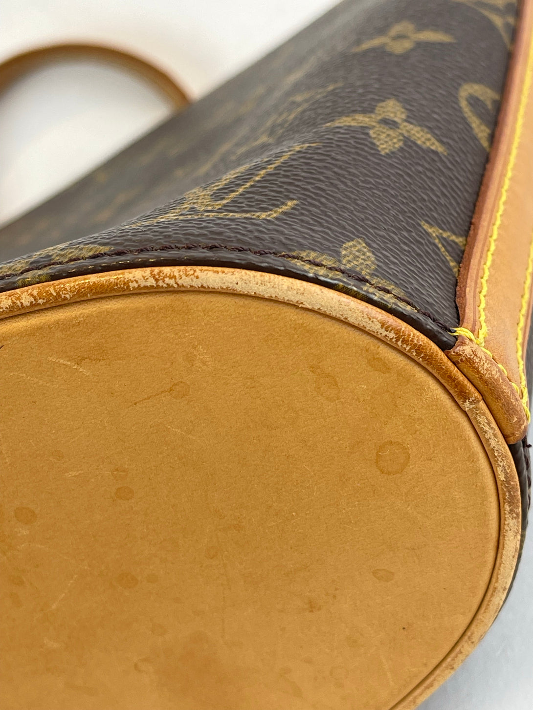 Good: Items show more prominent wear such as noticeable discoloration, stains and snags to fabric. May have worn corners and handles, tarnishing to hardware and creasing to leather. Pen or make up marks may be visible in the interior of the bag.