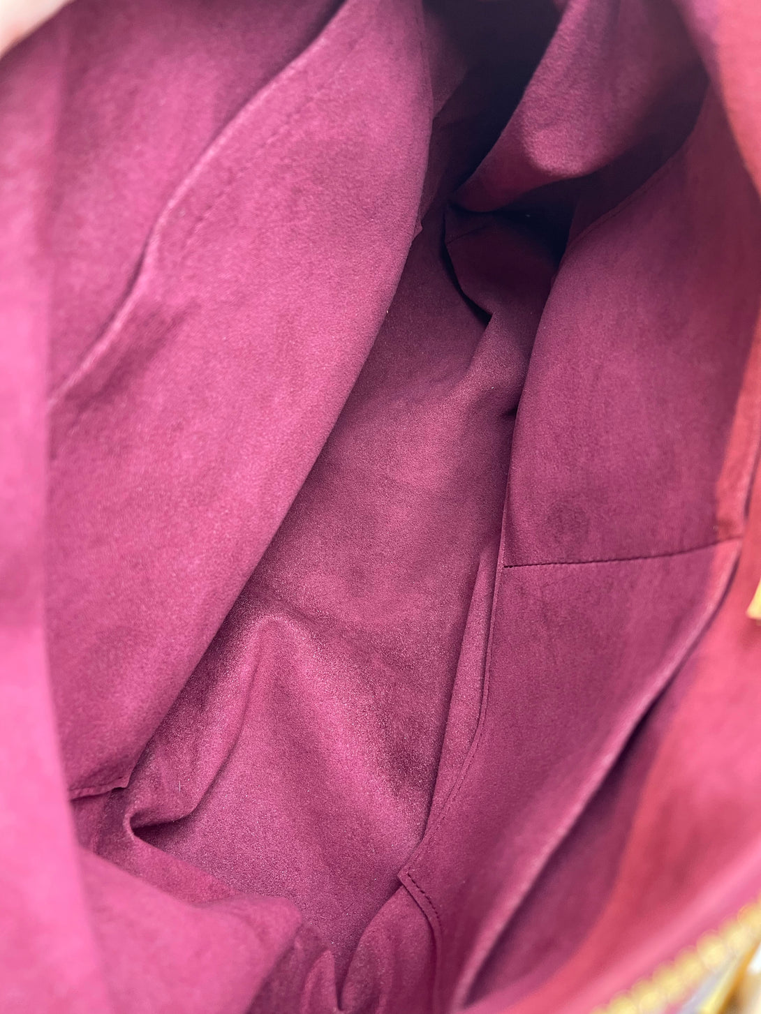 Good: Items show more prominent wear such as noticeable discoloration, stains and snags to fabric. May have worn corners and handles, tarnishing to hardware and creasing to leather. Pen or make up marks may be visible in the interior of the bag.