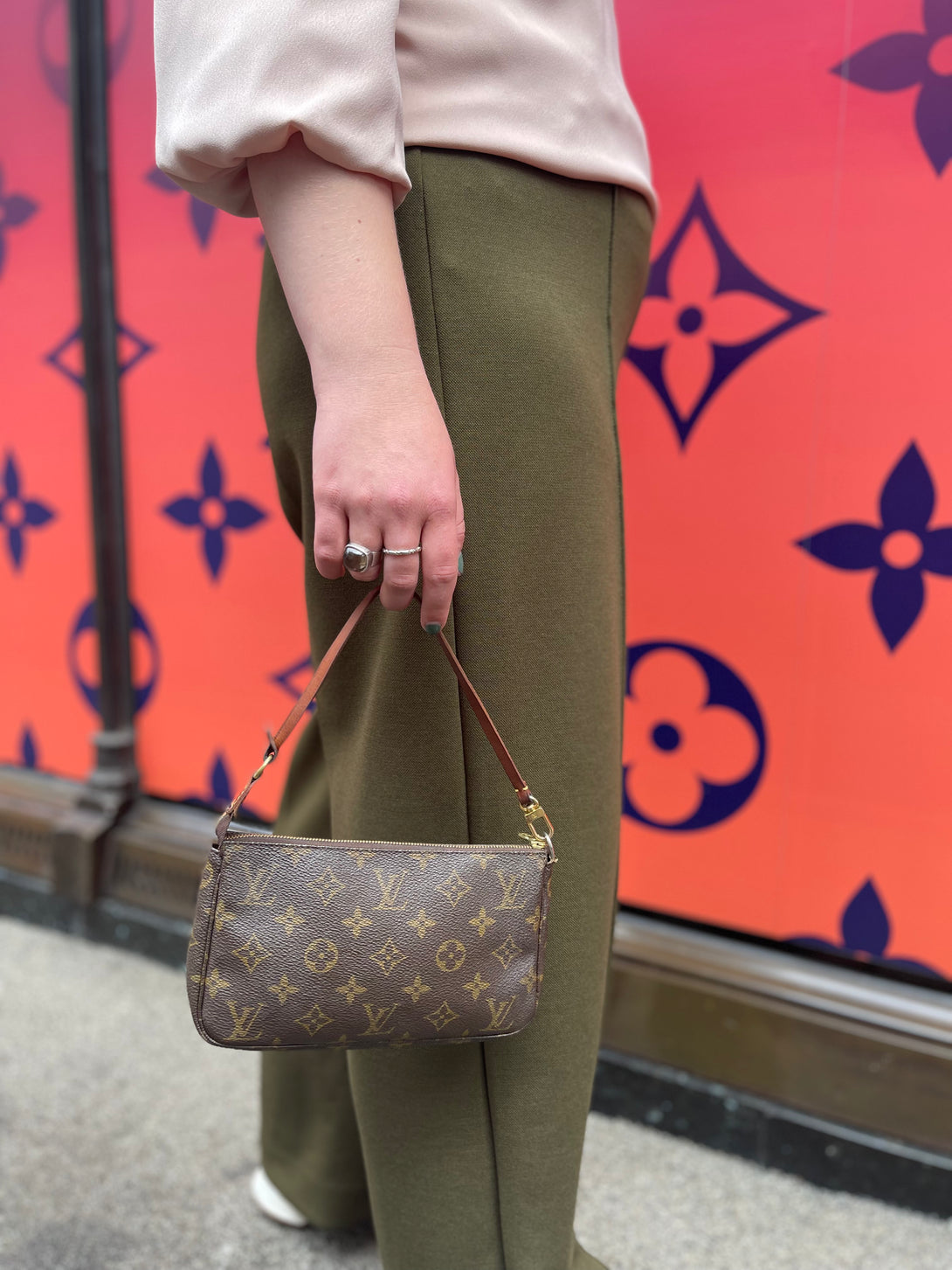 Good: Items show more prominent wear such as noticeable discoloration, stains and snags to fabric. May have worn corners and handles, tarnishing to hardware and creasing to leather. Pen or make up marks may be visible in the interior of the bag.