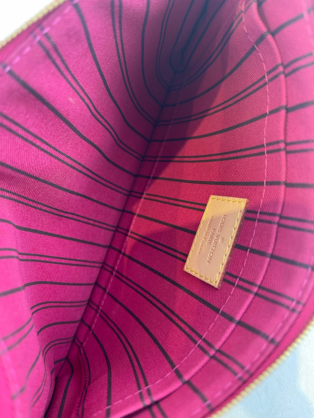 Good: Items show more prominent wear such as noticeable discoloration, stains and snags to fabric. May have worn corners and handles, tarnishing to hardware and creasing to leather. Pen or make up marks may be visible in the interior of the bag.