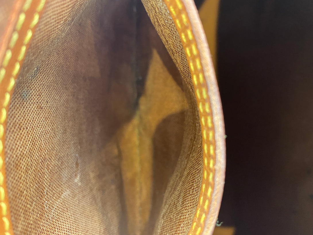 Good: Items show more prominent wear such as noticeable discoloration, stains and snags to fabric. May have worn corners and handles, tarnishing to hardware and creasing to leather. Pen or make up marks may be visible in the interior of the bag.