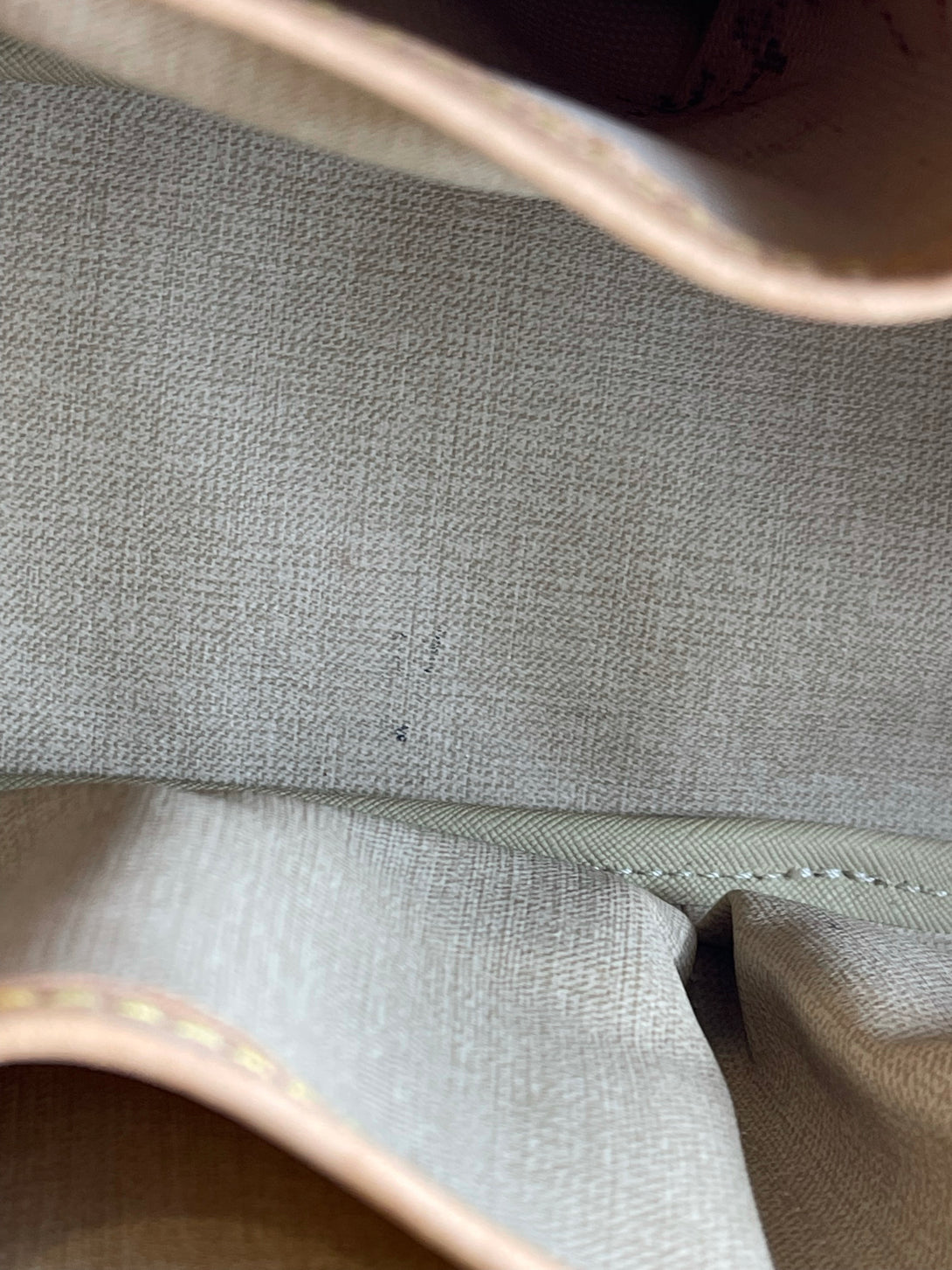 Good: Items show more prominent wear such as noticeable discoloration, stains and snags to fabric. May have worn corners and handles, tarnishing to hardware and creasing to leather. Pen or make up marks may be visible in the interior of the bag.