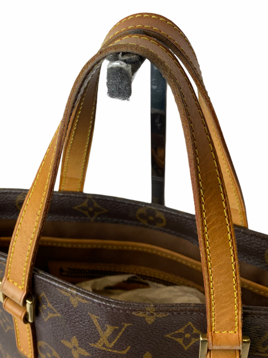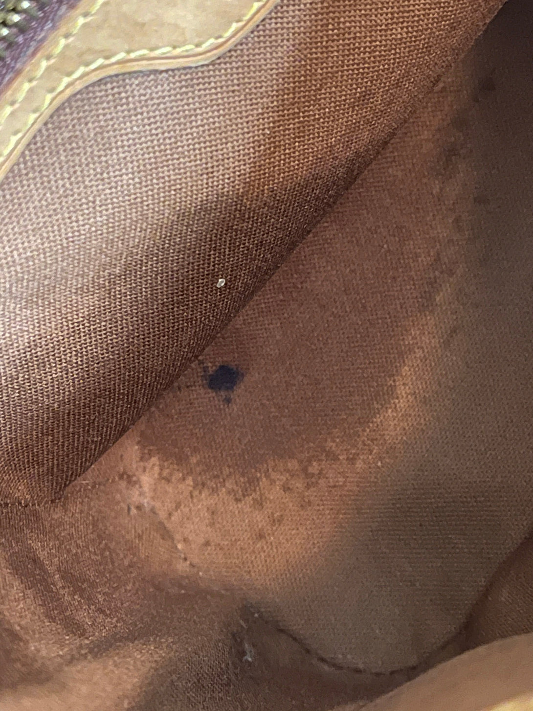 Good: Items show more prominent wear such as noticeable discoloration, stains and snags to fabric. May have worn corners and handles, tarnishing to hardware and creasing to leather. Pen or make up marks may be visible in the interior of the bag.