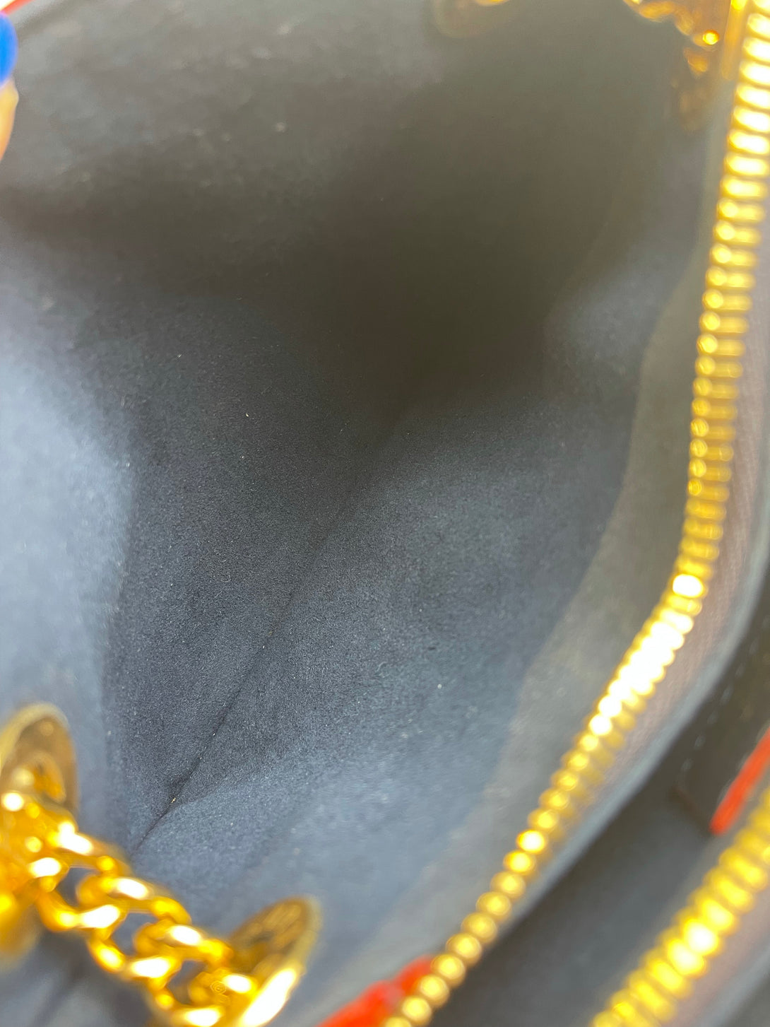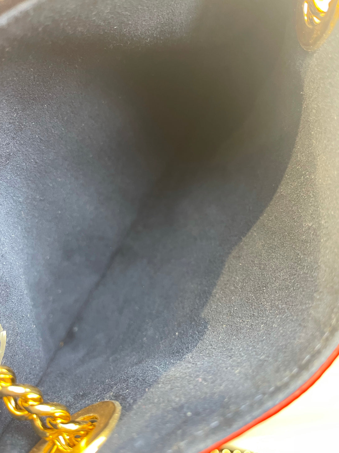 Good: Items show more prominent wear such as noticeable discoloration, stains and snags to fabric. May have worn corners and handles, tarnishing to hardware and creasing to leather. Pen or make up marks may be visible in the interior of the bag.