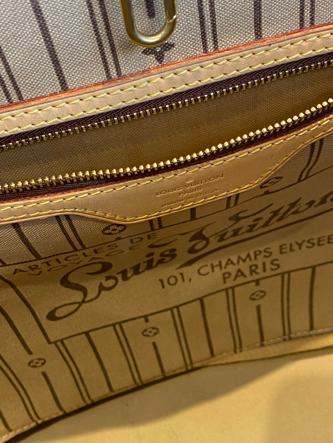 Good: Items show more prominent wear such as noticeable discoloration, stains and snags to fabric. May have worn corners and handles, tarnishing to hardware and creasing to leather. Pen or make up marks may be visible in the interior of the bag.