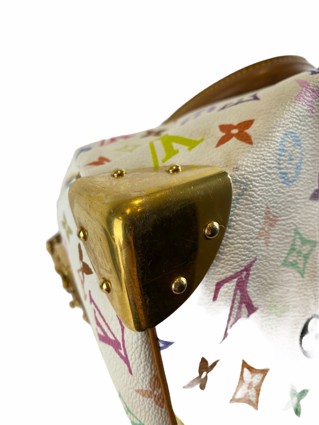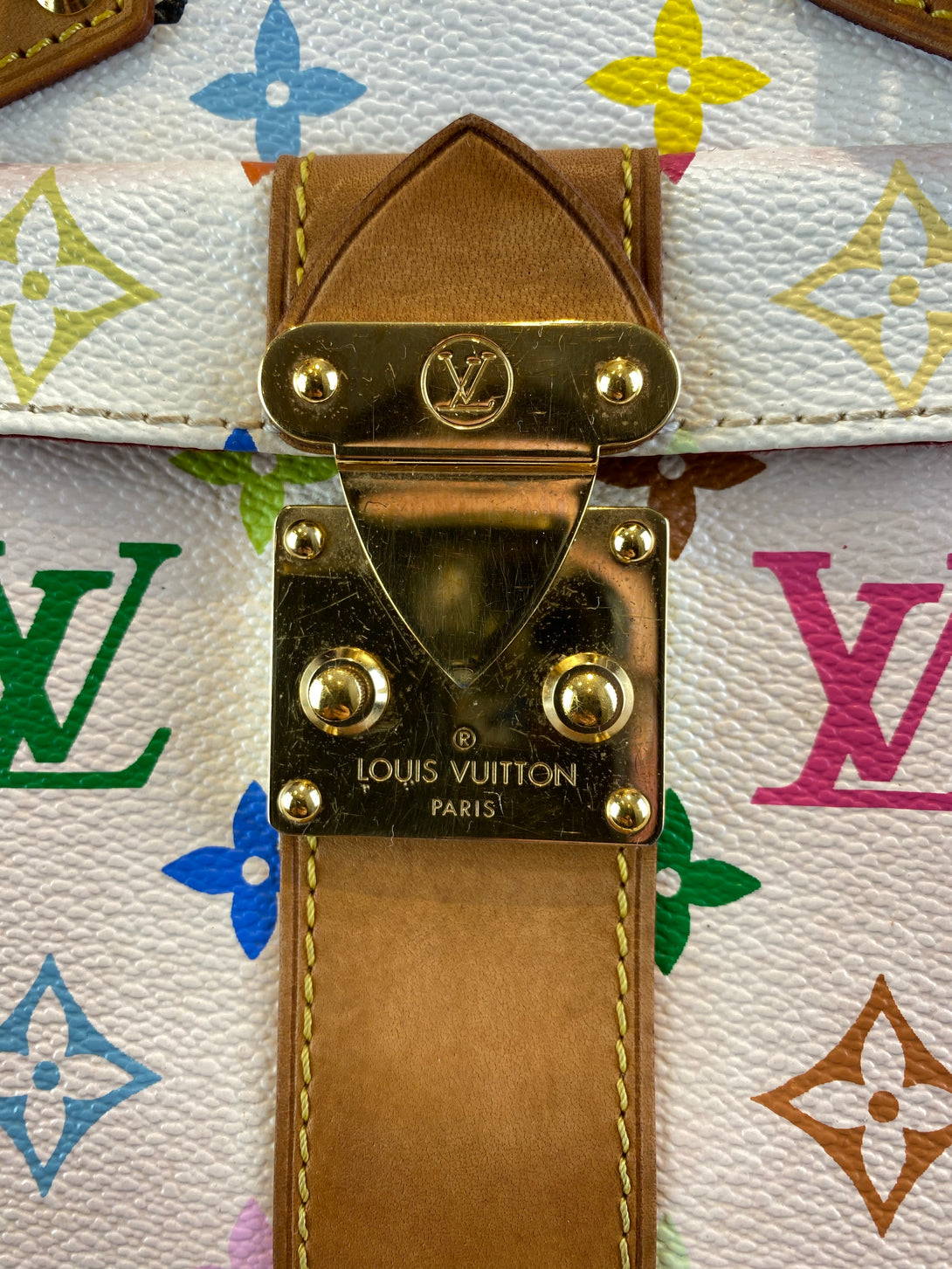 • Features multicolour Monogram on white canvas with natural leather trim
