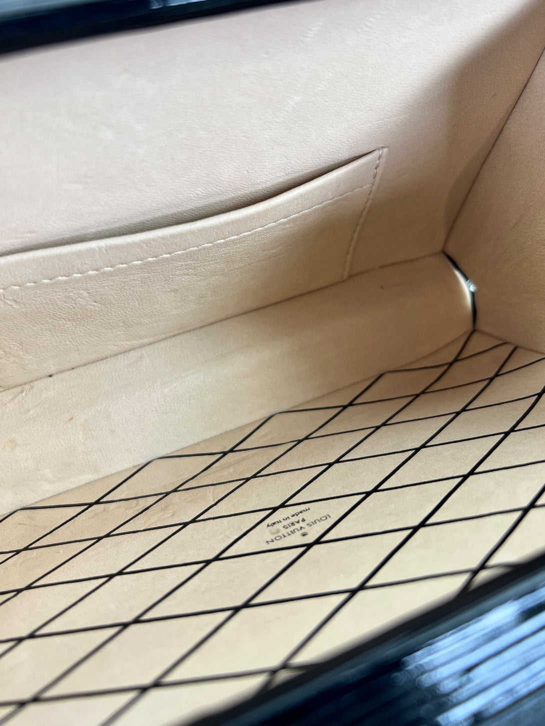 Good: Items show more prominent wear such as noticeable discoloration, stains and snags to fabric. May have worn corners and handles, tarnishing to hardware and creasing to leather. Pen or make up marks may be visible in the interior of the bag.