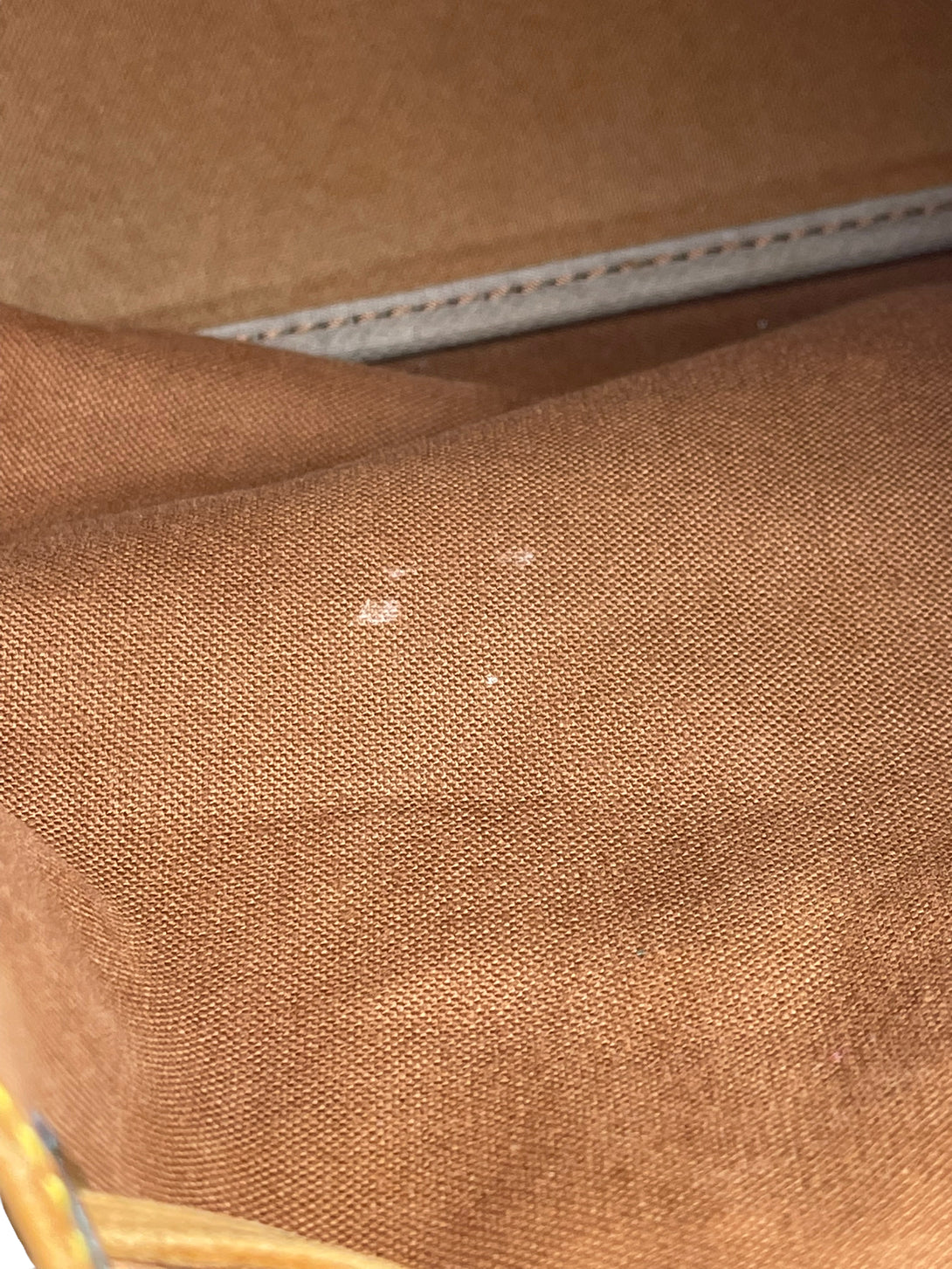 Good: Items show more prominent wear such as noticeable discoloration, stains and snags to fabric. May have worn corners and handles, tarnishing to hardware and creasing to leather. Pen or make up marks may be visible in the interior of the bag.