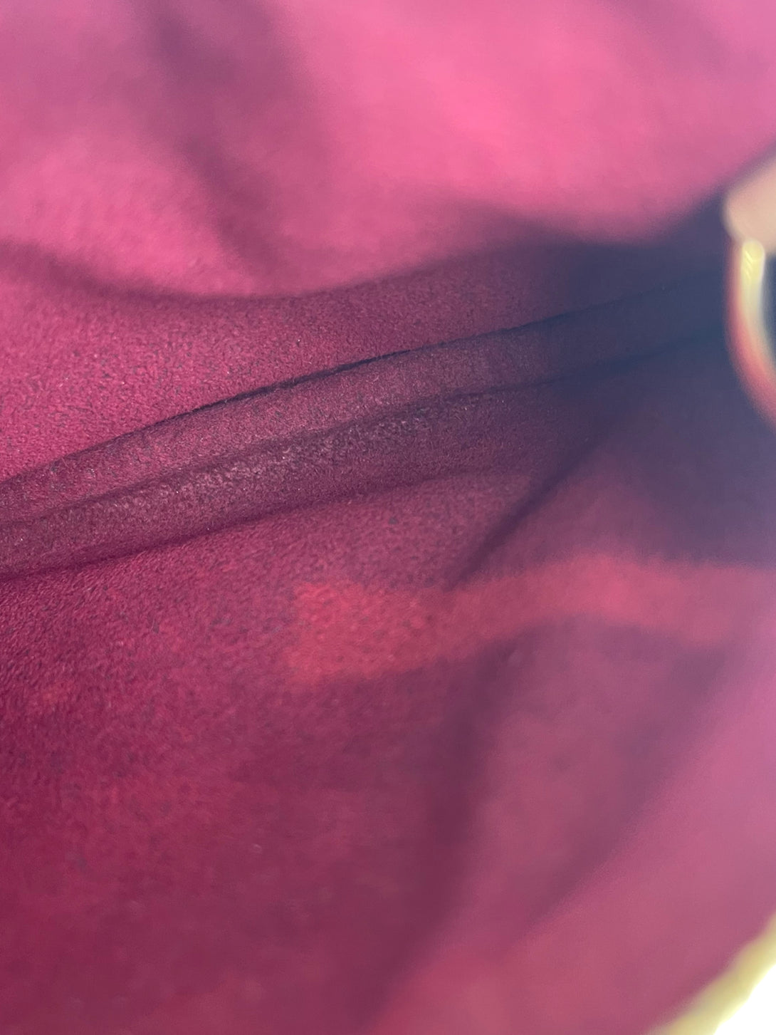 Good: Items show more prominent wear such as noticeable discoloration, stains and snags to fabric. May have worn corners and handles, tarnishing to hardware and creasing to leather. Pen or make up marks may be visible in the interior of the bag.