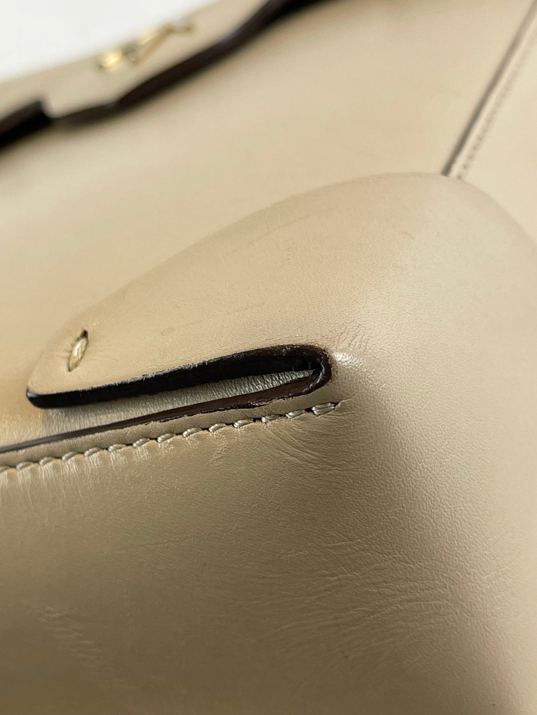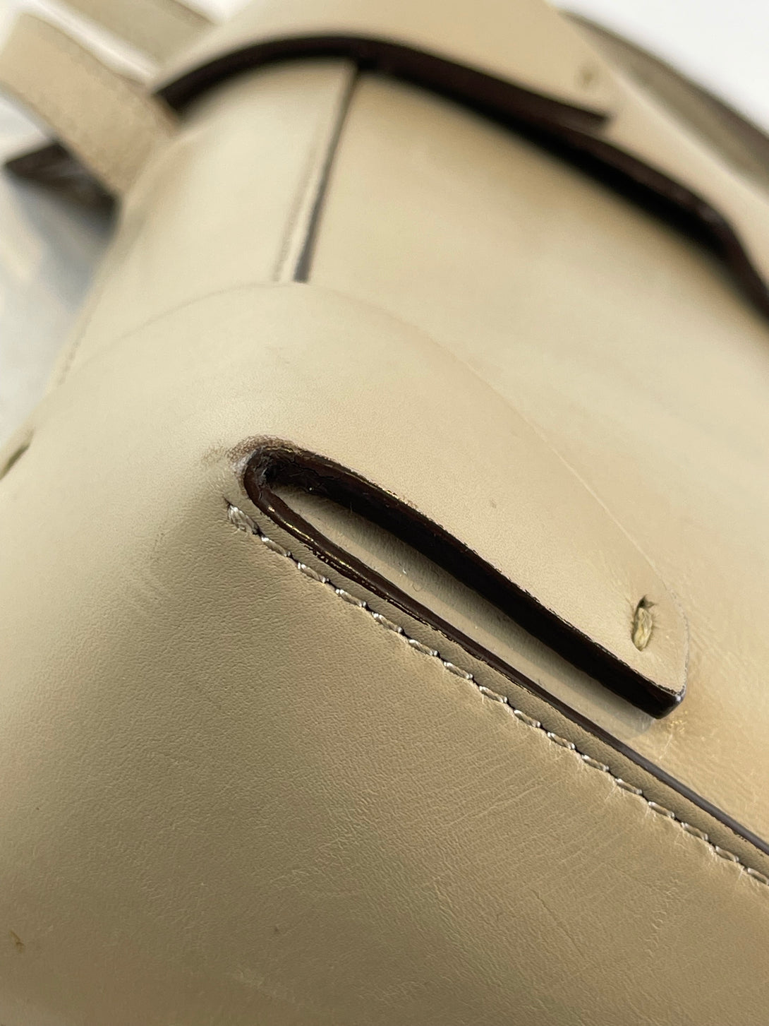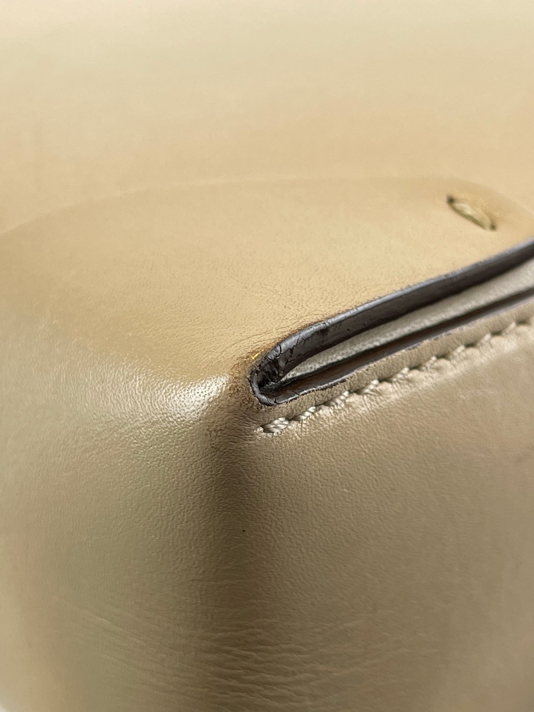 Good: Items show more prominent wear such as noticeable discoloration, stains and snags to fabric. May have worn corners and handles, tarnishing to hardware and creasing to leather. Pen or make up marks may be visible in the interior of the bag.