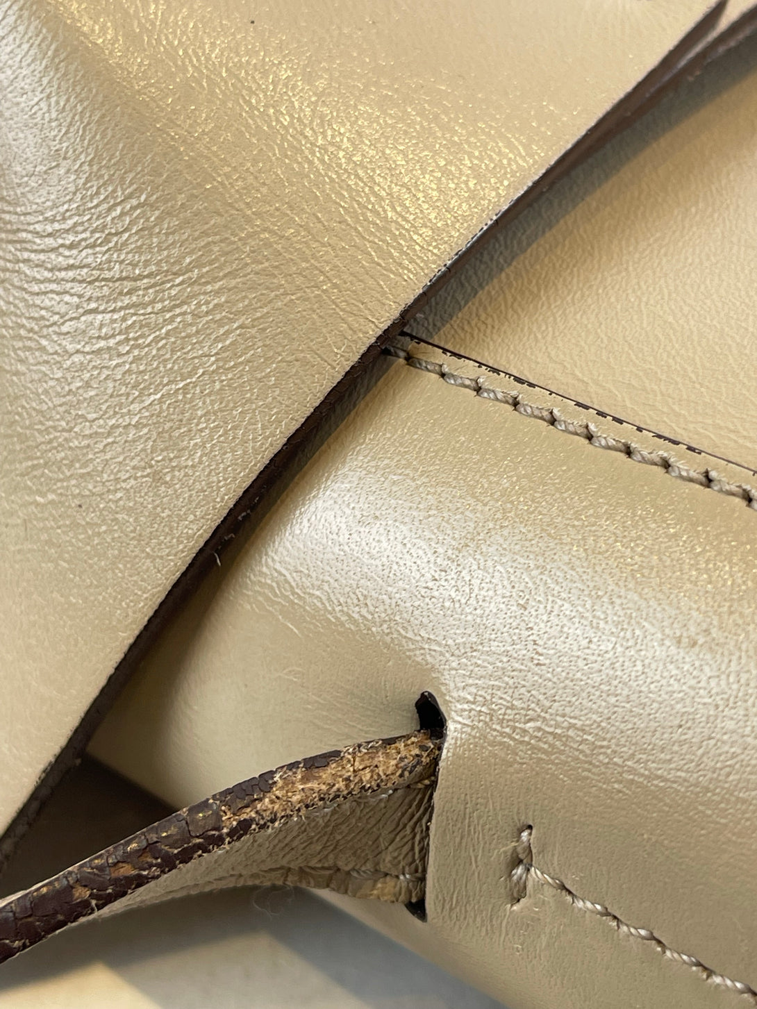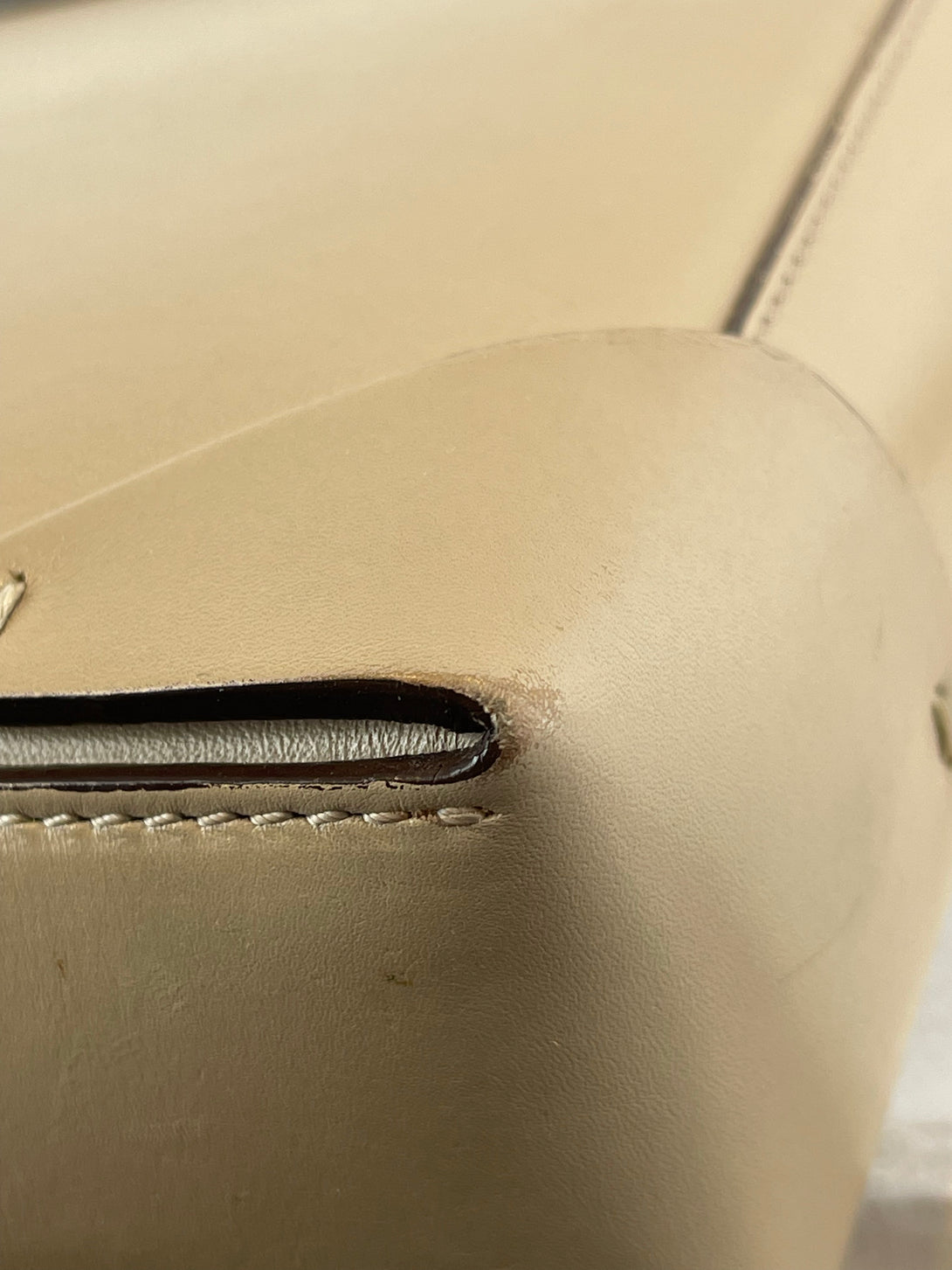 Fair: Very prominent wear, may have holes on corners, severe scuffs, piping of bag showing and pen marks to exterior. Interior may have pen or make up marks.