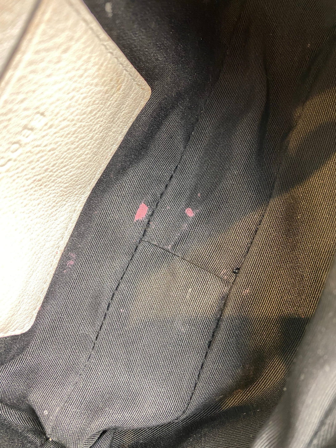 Good: Items show more prominent wear such as noticeable discoloration, stains and snags to fabric. May have worn corners and handles, tarnishing to hardware and creasing to leather. Pen or make up marks may be visible in the interior of the bag.