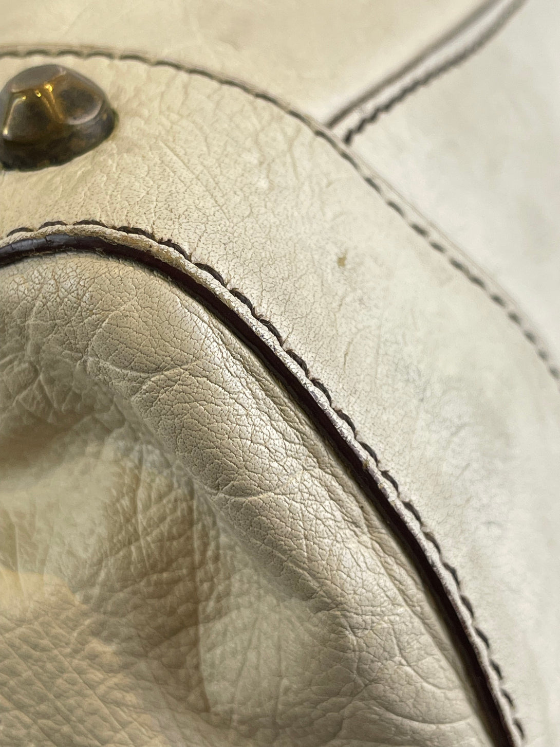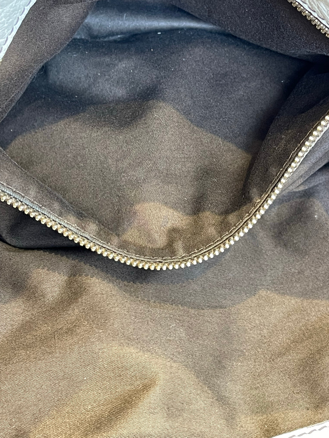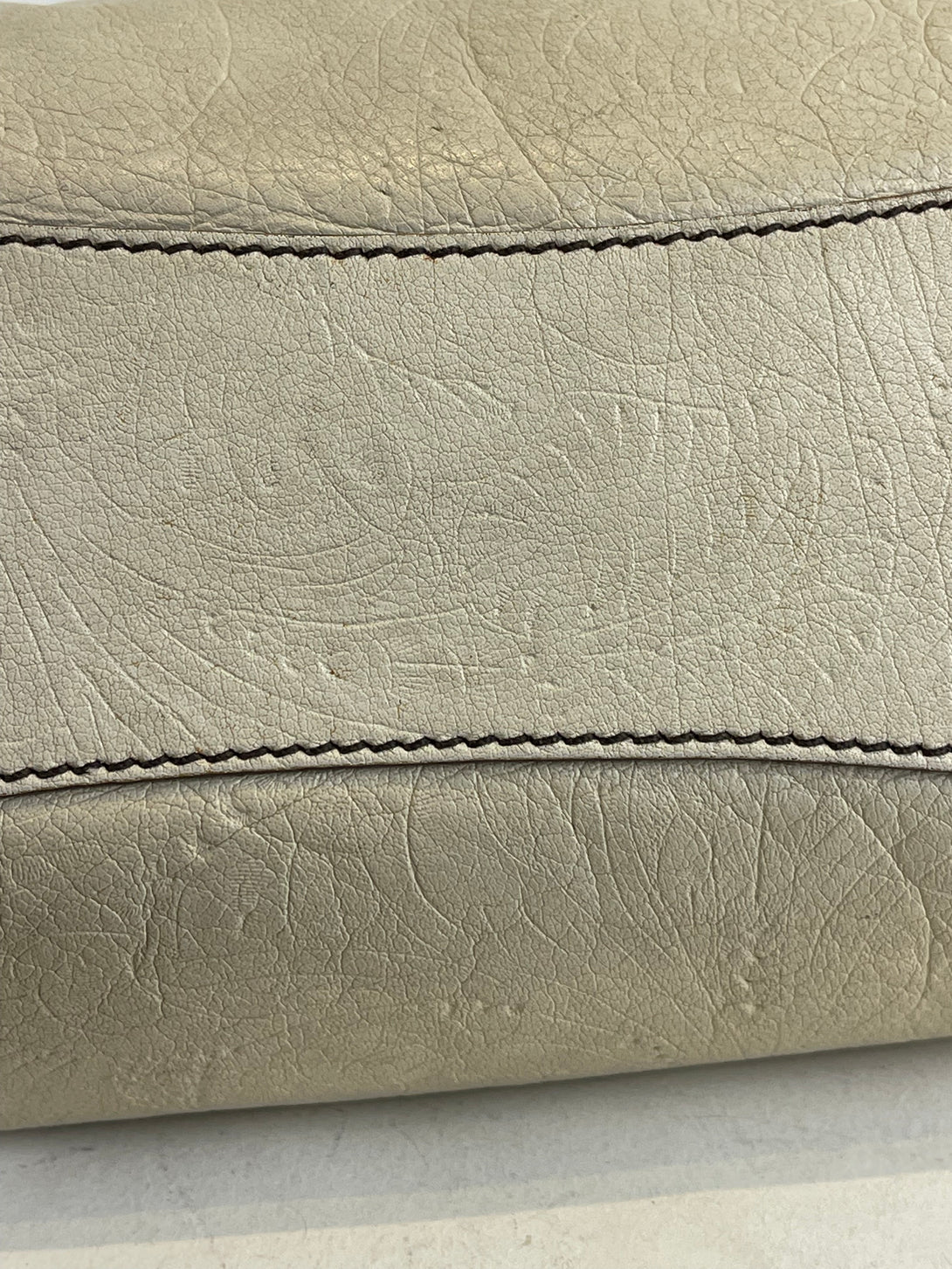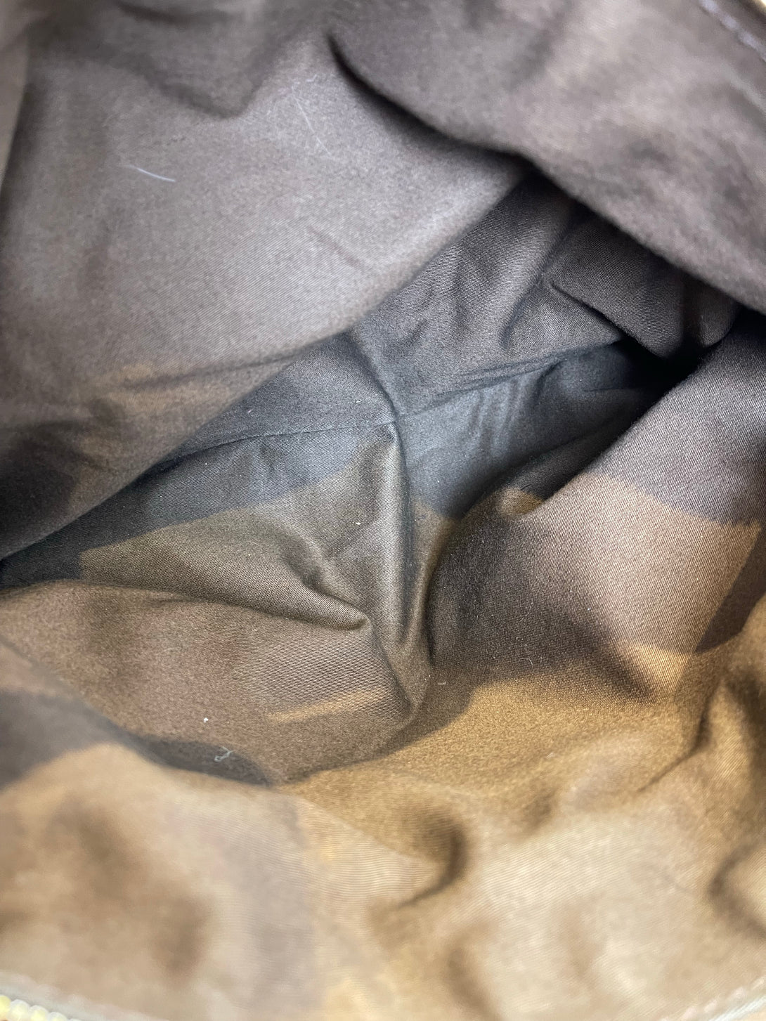 Good: Items show more prominent wear such as noticeable discoloration, stains and snags to fabric. May have worn corners and handles, tarnishing to hardware and creasing to leather. Pen or make up marks may be visible in the interior of the bag.