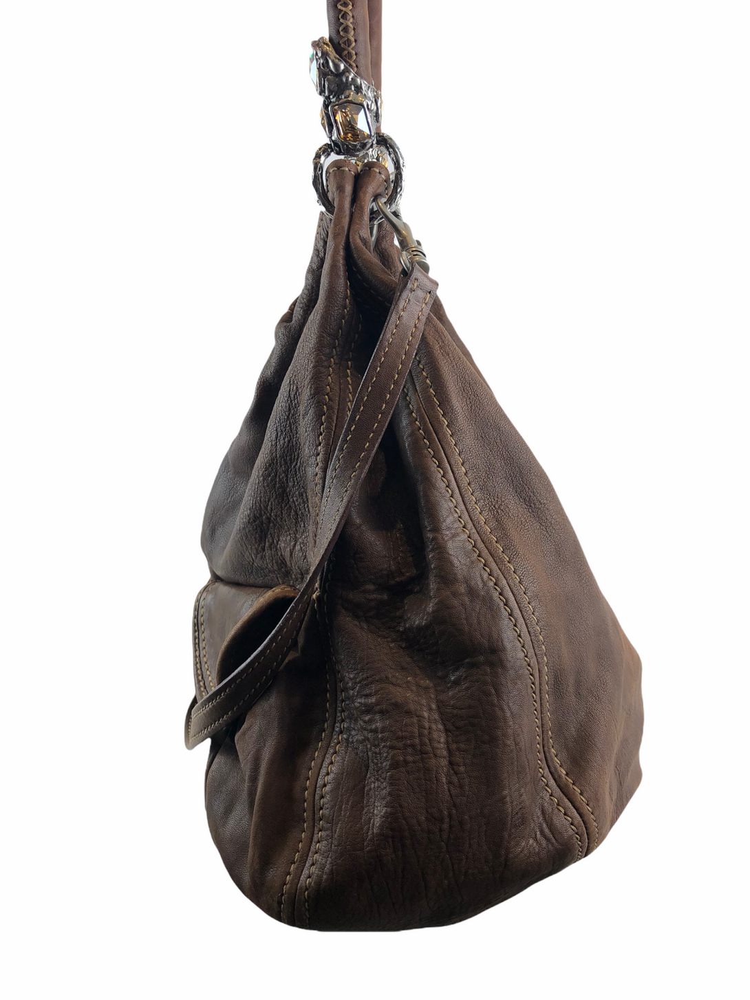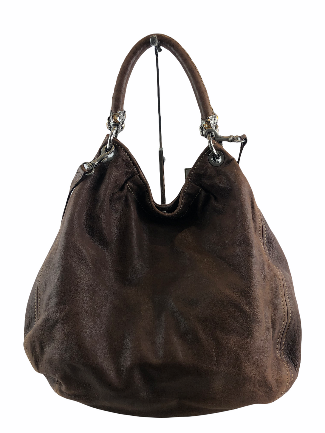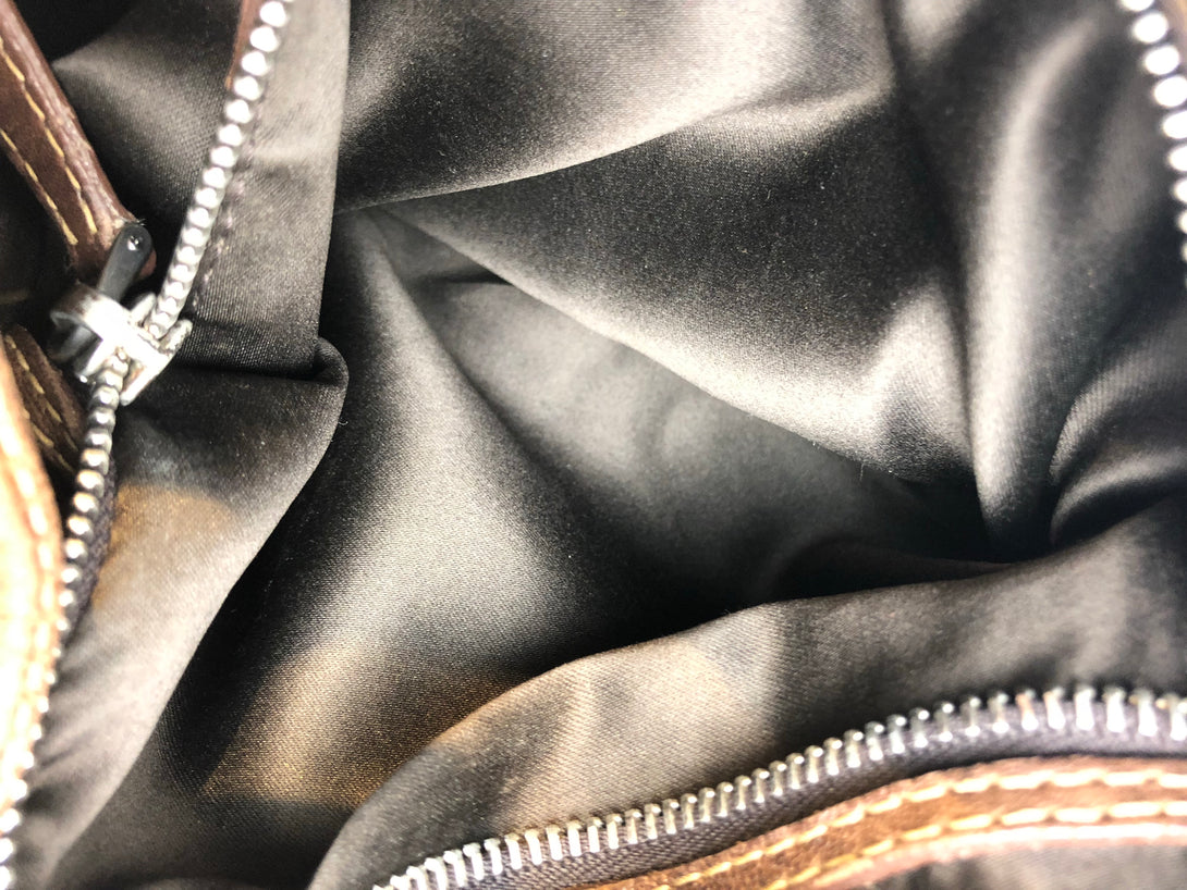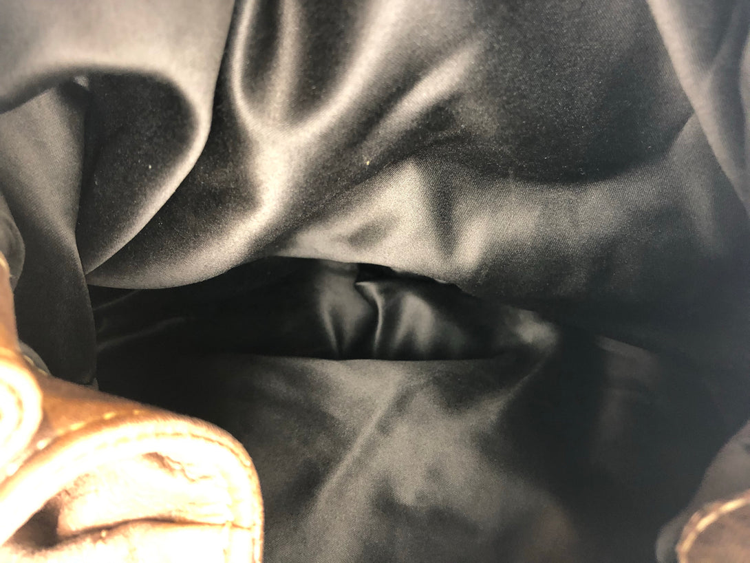 Good: Items show more prominent wear such as noticeable discoloration, stains and snags to fabric. May have worn corners and handles, tarnishing to hardware and creasing to leather. Pen or make up marks may be visible in the interior of the bag.