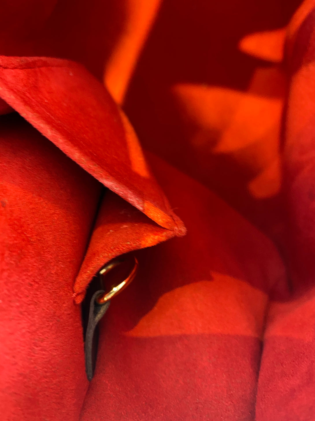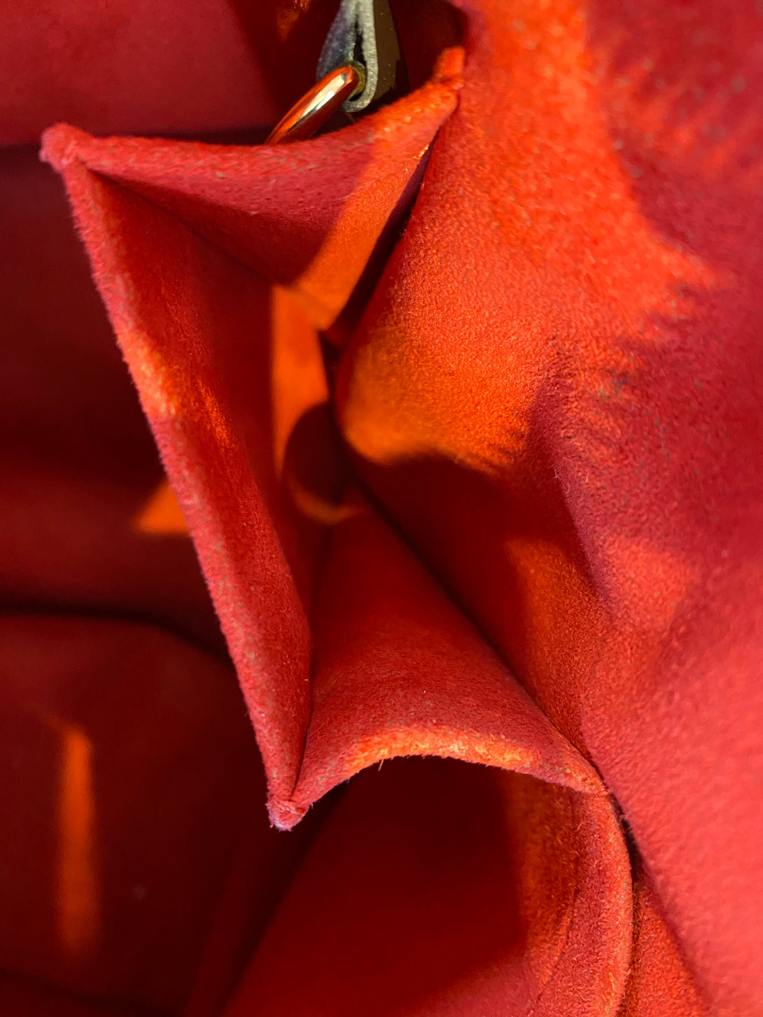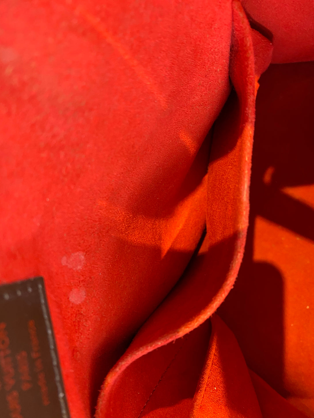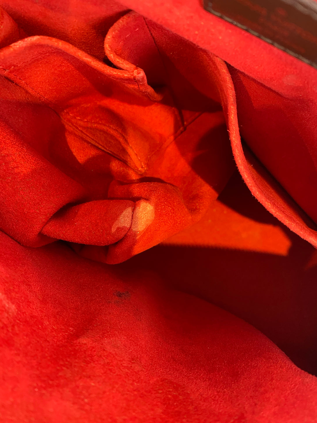 Good: Items show more prominent wear such as noticeable discoloration, stains and snags to fabric. May have worn corners and handles, tarnishing to hardware and creasing to leather. Pen or make up marks may be visible in the interior of the bag.