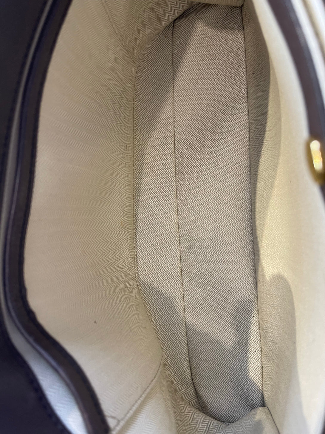 Good: Items show more prominent wear such as noticeable discoloration, stains and snags to fabric. May have worn corners and handles, tarnishing to hardware and creasing to leather. Pen or make up marks may be visible in the interior of the bag.