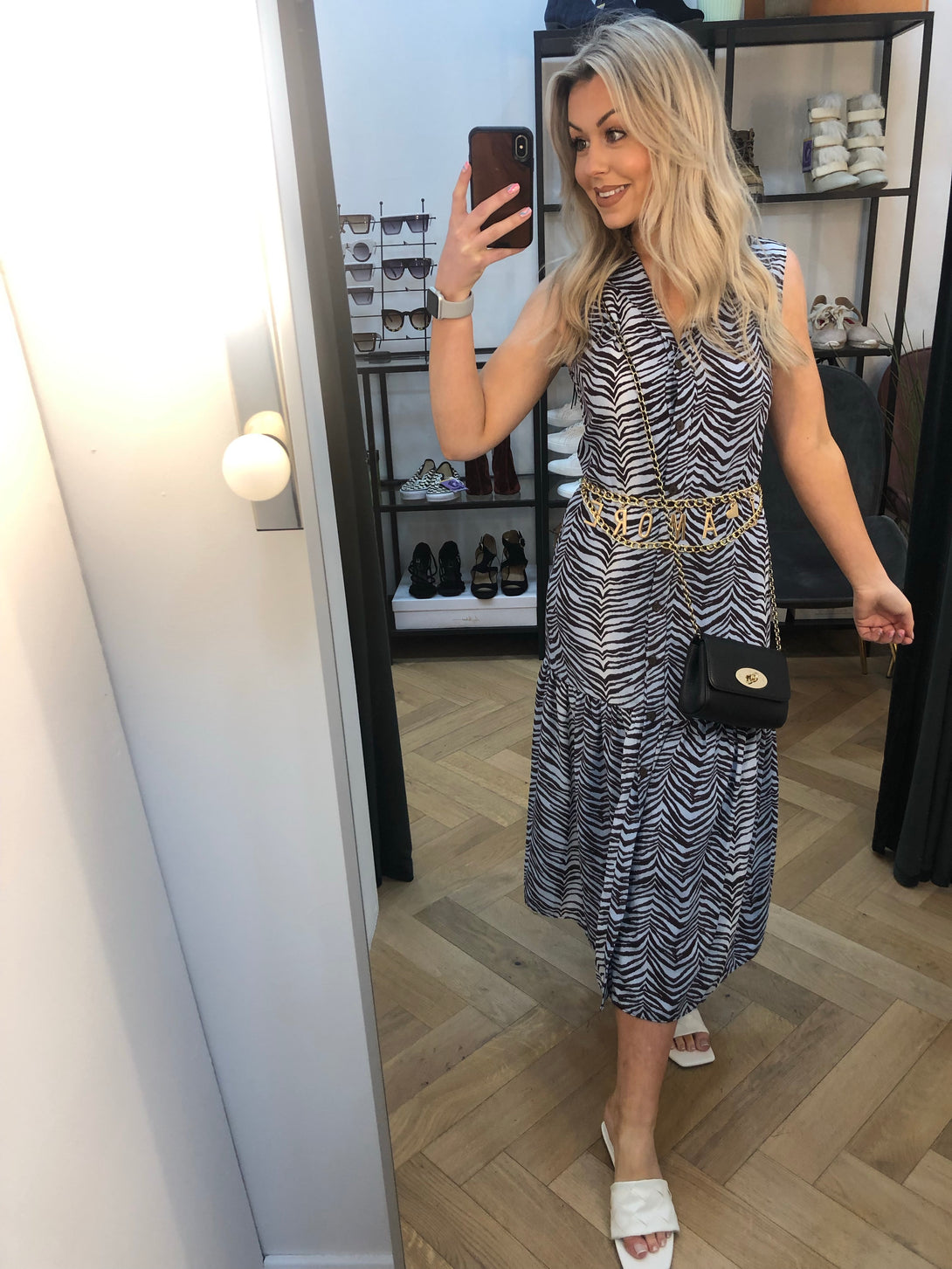 - Goldtone hardware