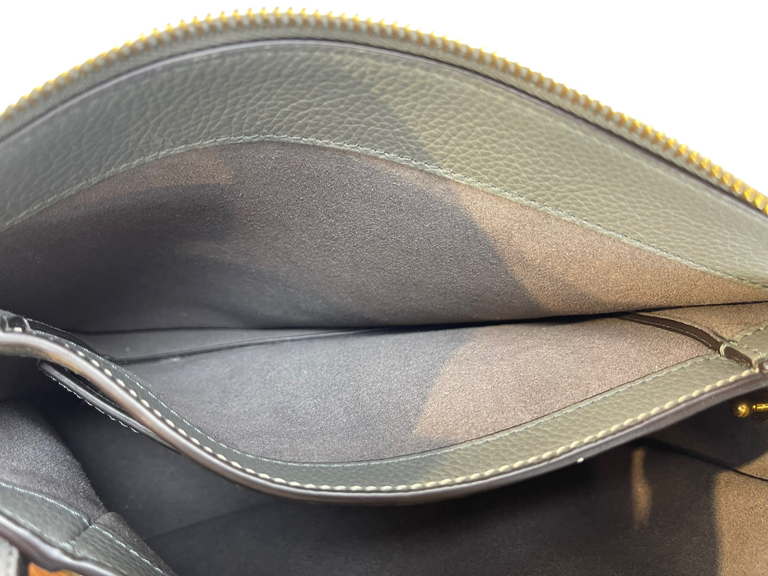 Good: Items show more prominent wear such as noticeable discoloration, stains and snags to fabric. May have worn corners and handles, tarnishing to hardware and creasing to leather. Pen or make up marks may be visible in the interior of the bag.