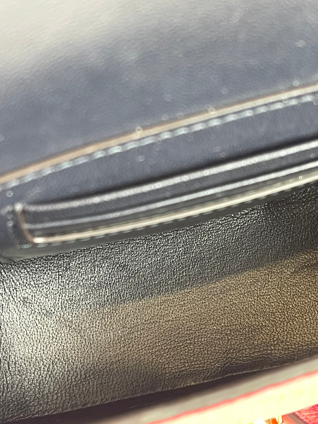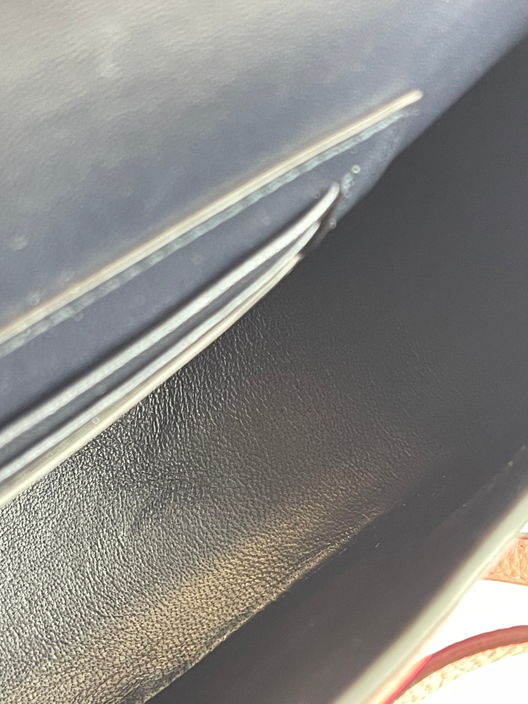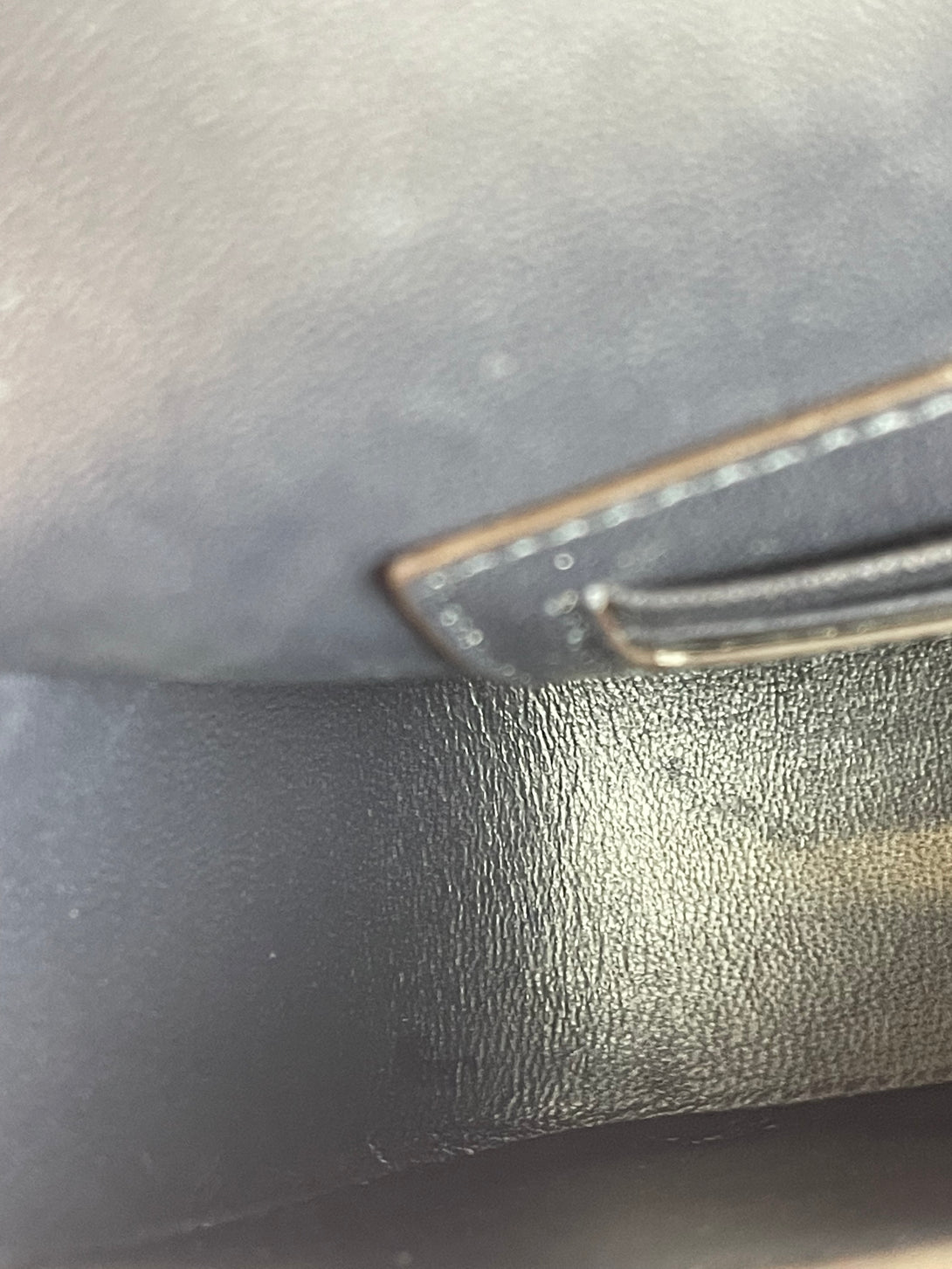 Good: Items show more prominent wear such as noticeable discoloration, stains and snags to fabric. May have worn corners and handles, tarnishing to hardware and creasing to leather. Pen or make up marks may be visible in the interior of the bag.