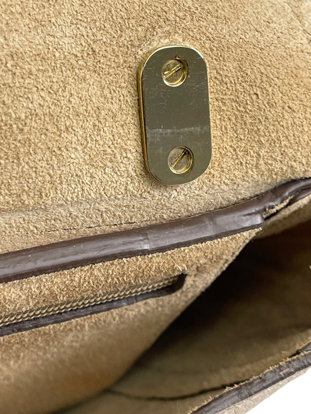 Good: Items show more prominent wear such as noticeable discoloration, stains and snags to fabric. May have worn corners and handles, tarnishing to hardware and creasing to leather. Pen or make up marks may be visible in the interior of the bag.