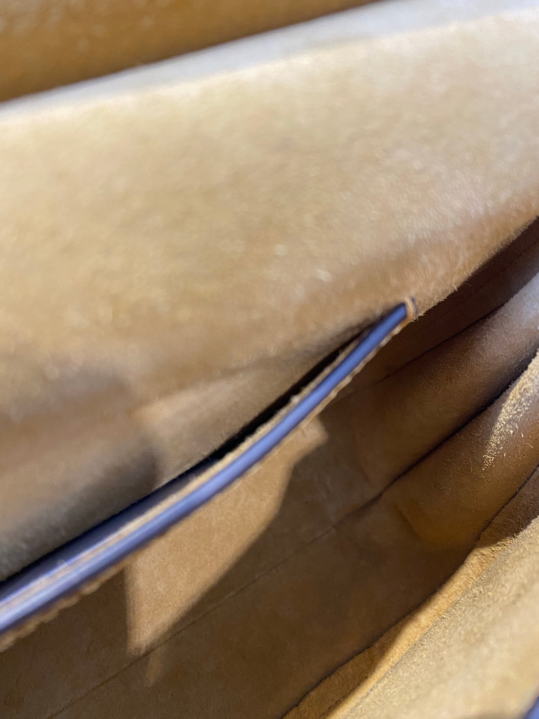 Good: Items show more prominent wear such as noticeable discoloration, stains and snags to fabric. May have worn corners and handles, tarnishing to hardware and creasing to leather. Pen or make up marks may be visible in the interior of the bag.