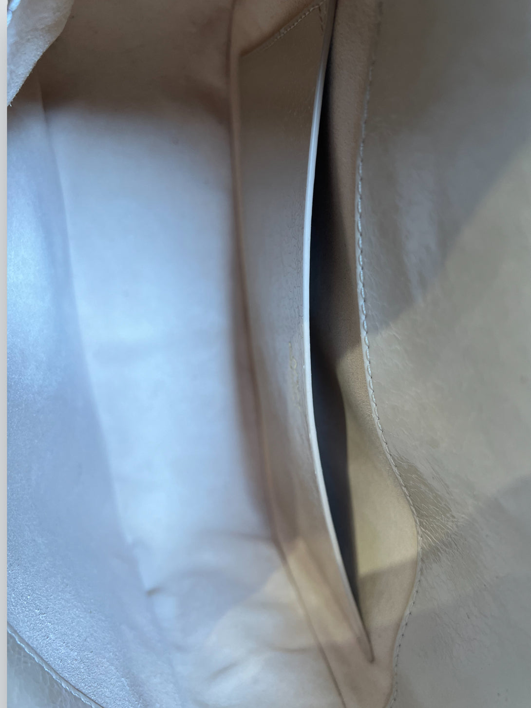 Good: Items show more prominent wear such as noticeable discoloration, stains and snags to fabric. May have worn corners and handles, tarnishing to hardware and creasing to leather. Pen or make up marks may be visible in the interior of the bag.