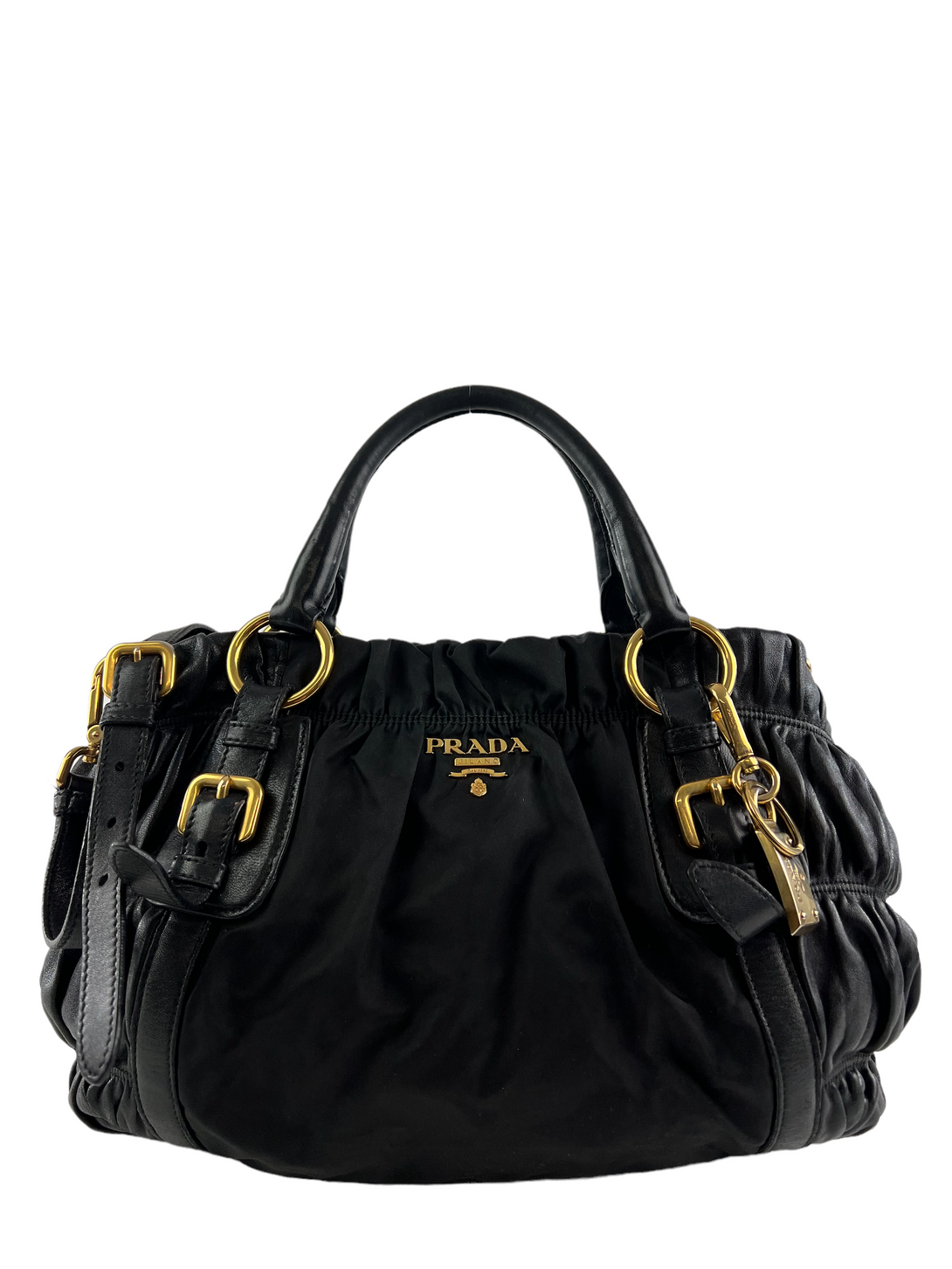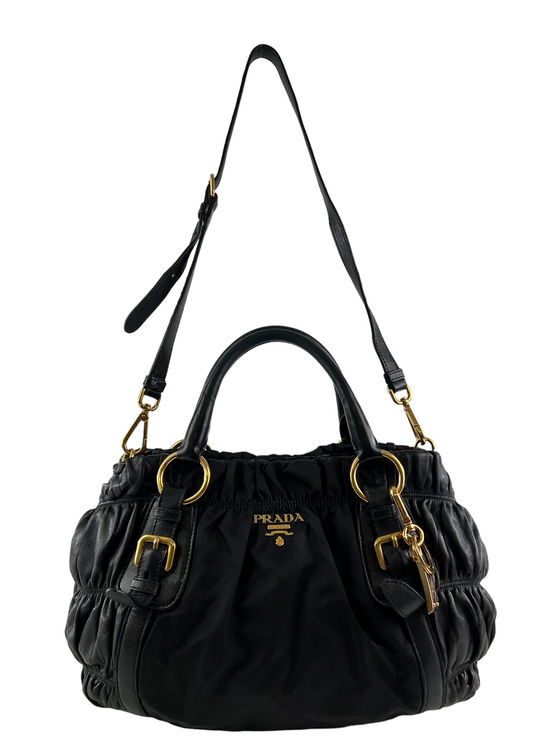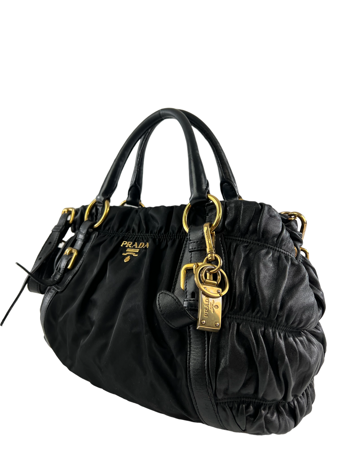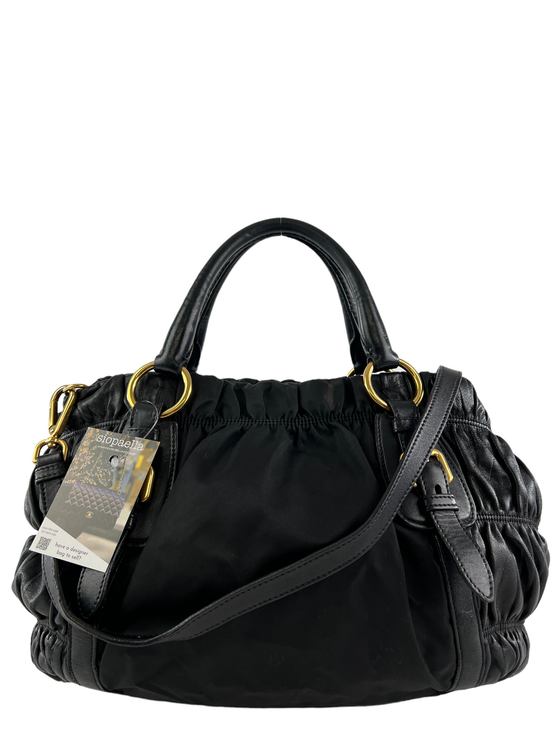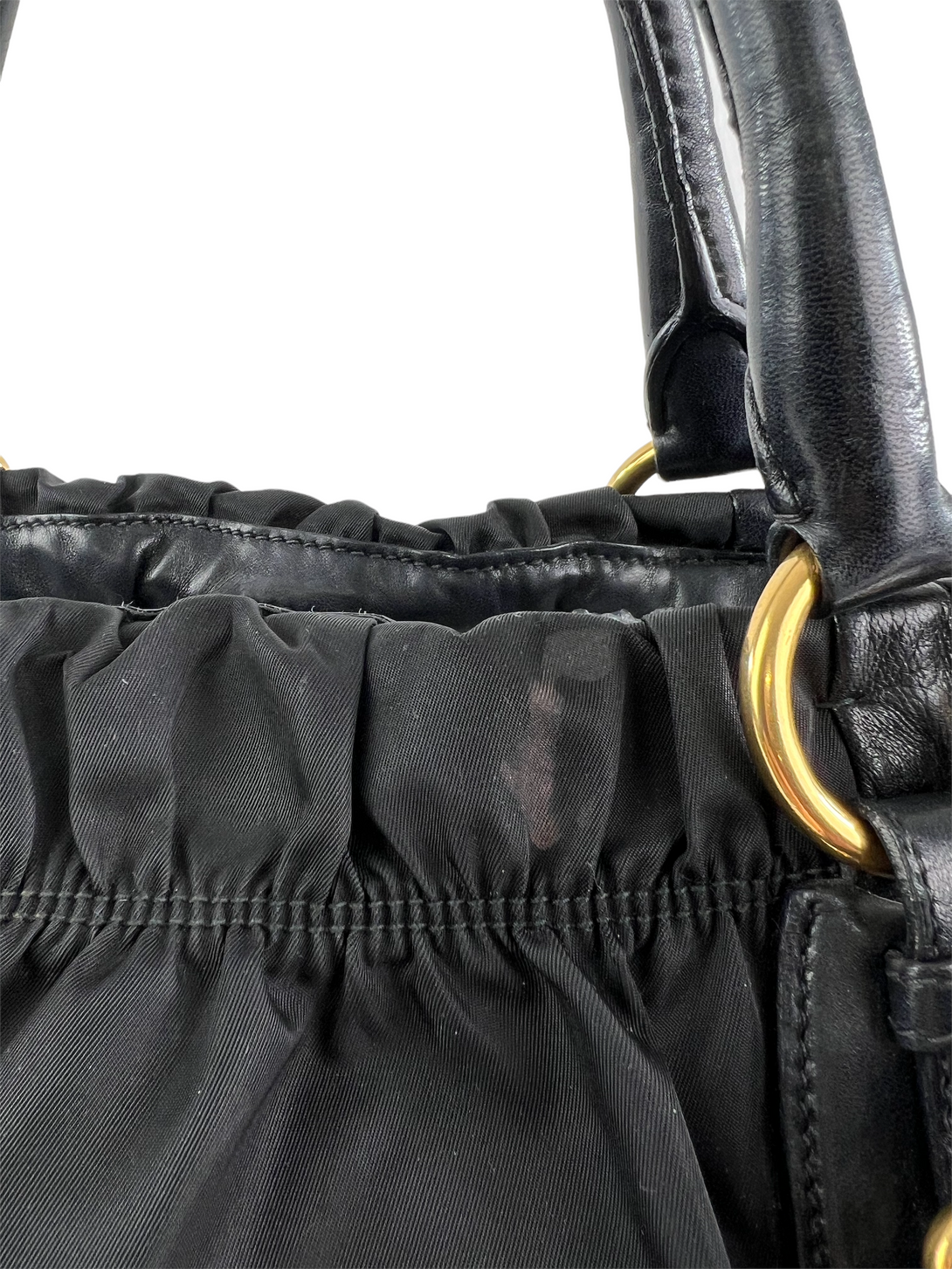 Prada Black Nylon & Leather Ruched Shoulder Bag