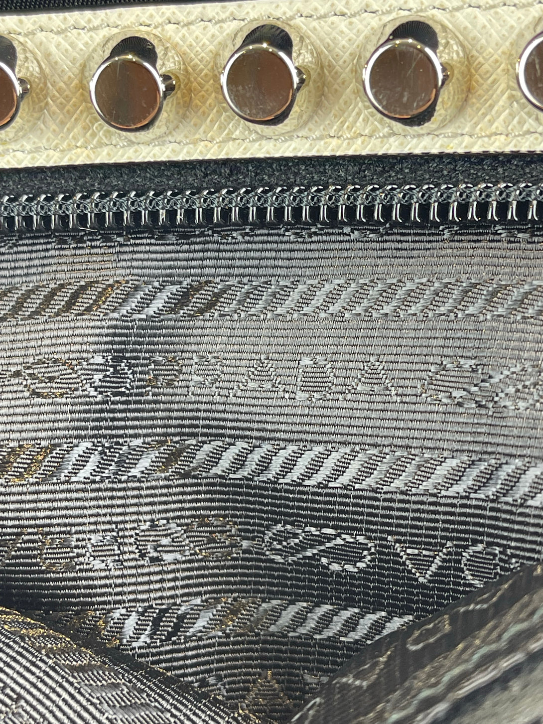 Good: Items show more prominent wear such as noticeable discoloration, stains and snags to fabric. May have worn corners and handles, tarnishing to hardware and creasing to leather. Pen or make up marks may be visible in the interior of the bag.