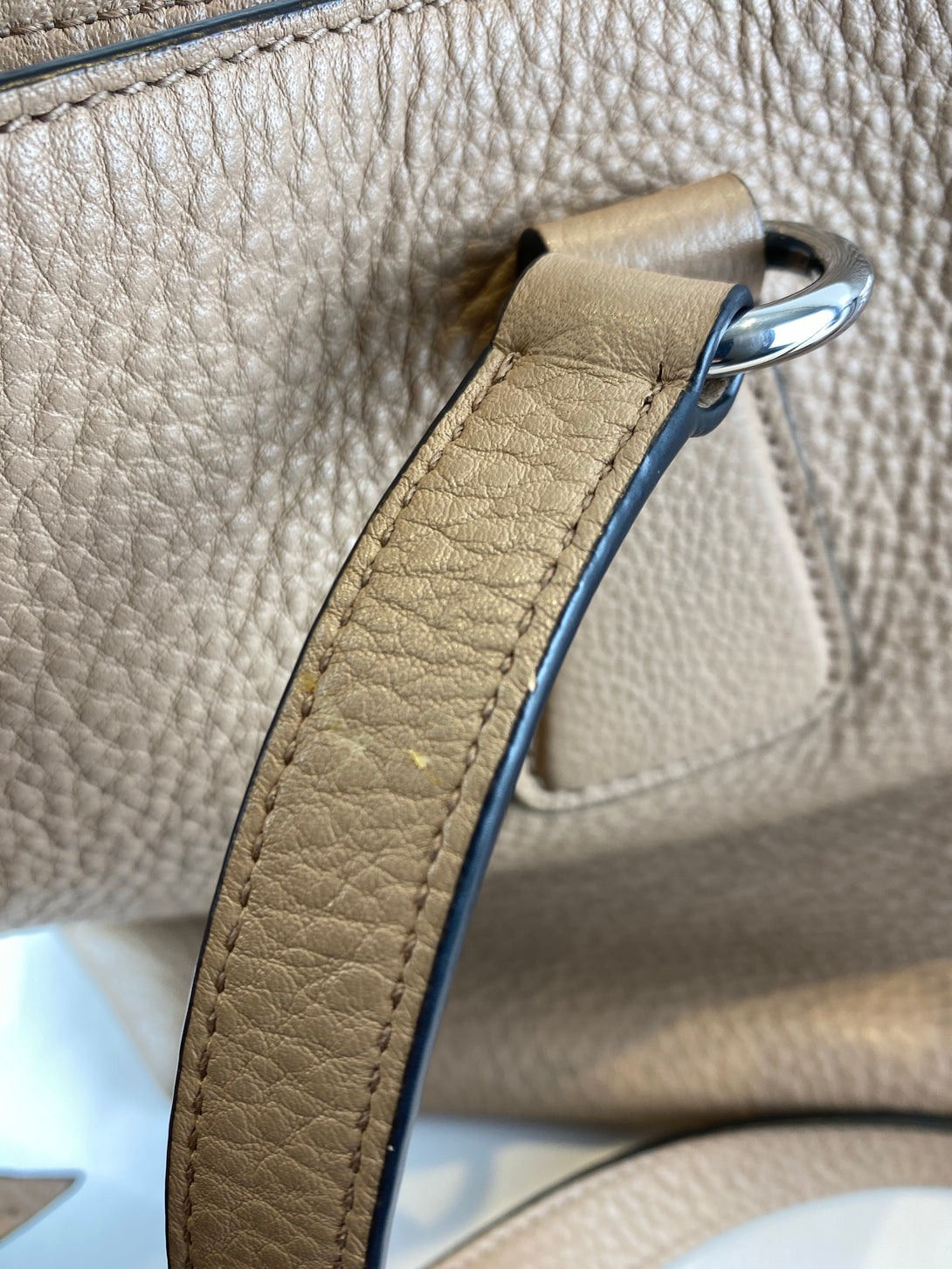 Good: Items show more prominent wear such as noticeable discoloration, stains and snags to fabric. May have worn corners and handles, tarnishing to hardware and creasing to leather. Pen or make up marks may be visible in the interior of the bag.