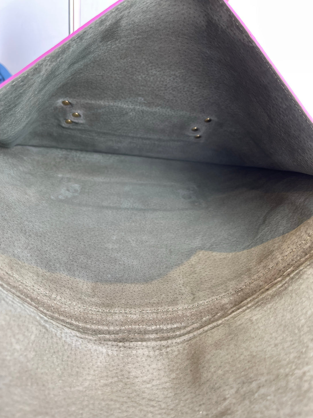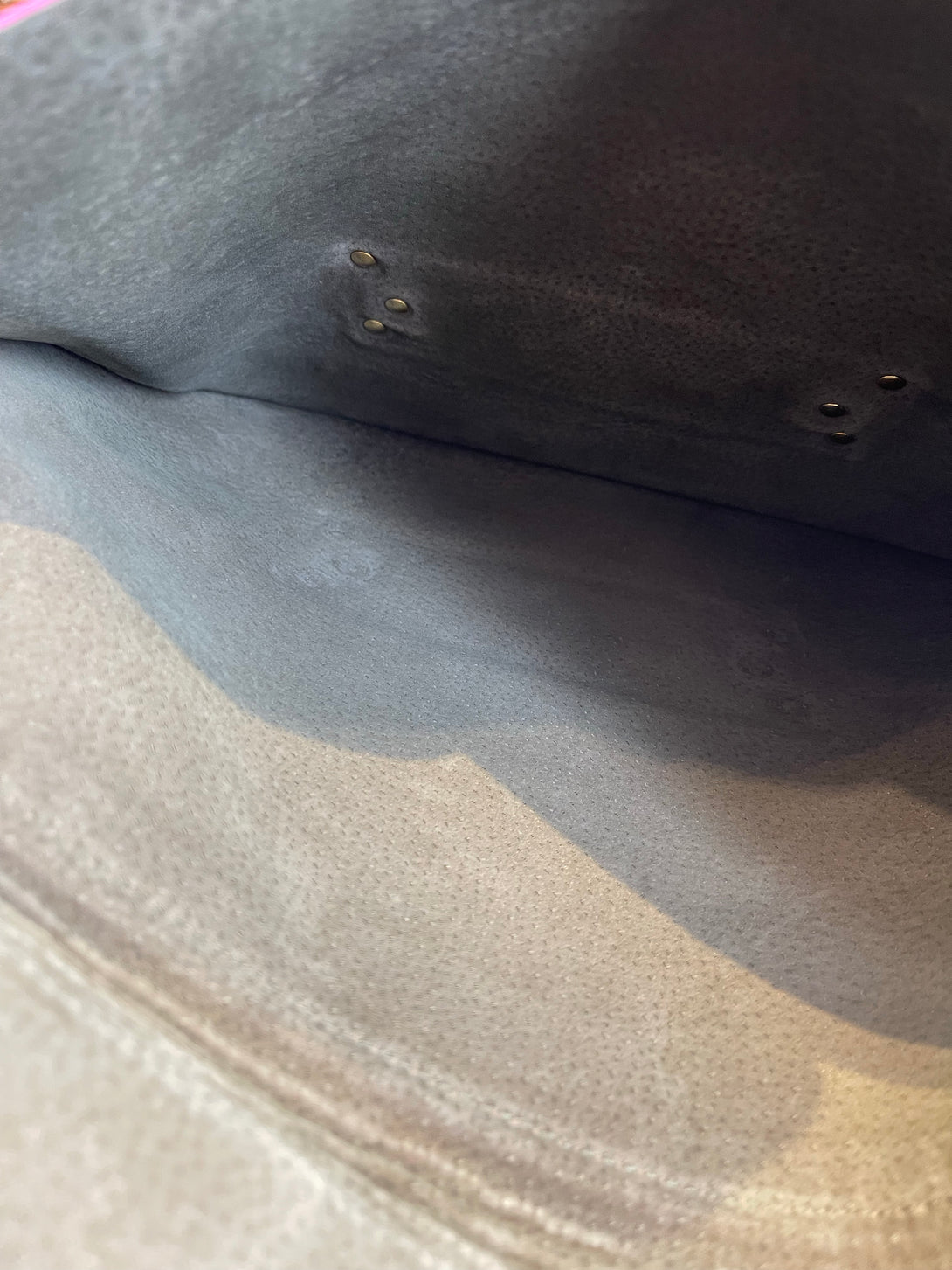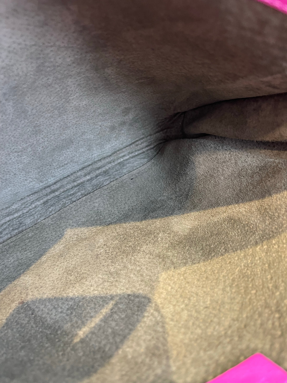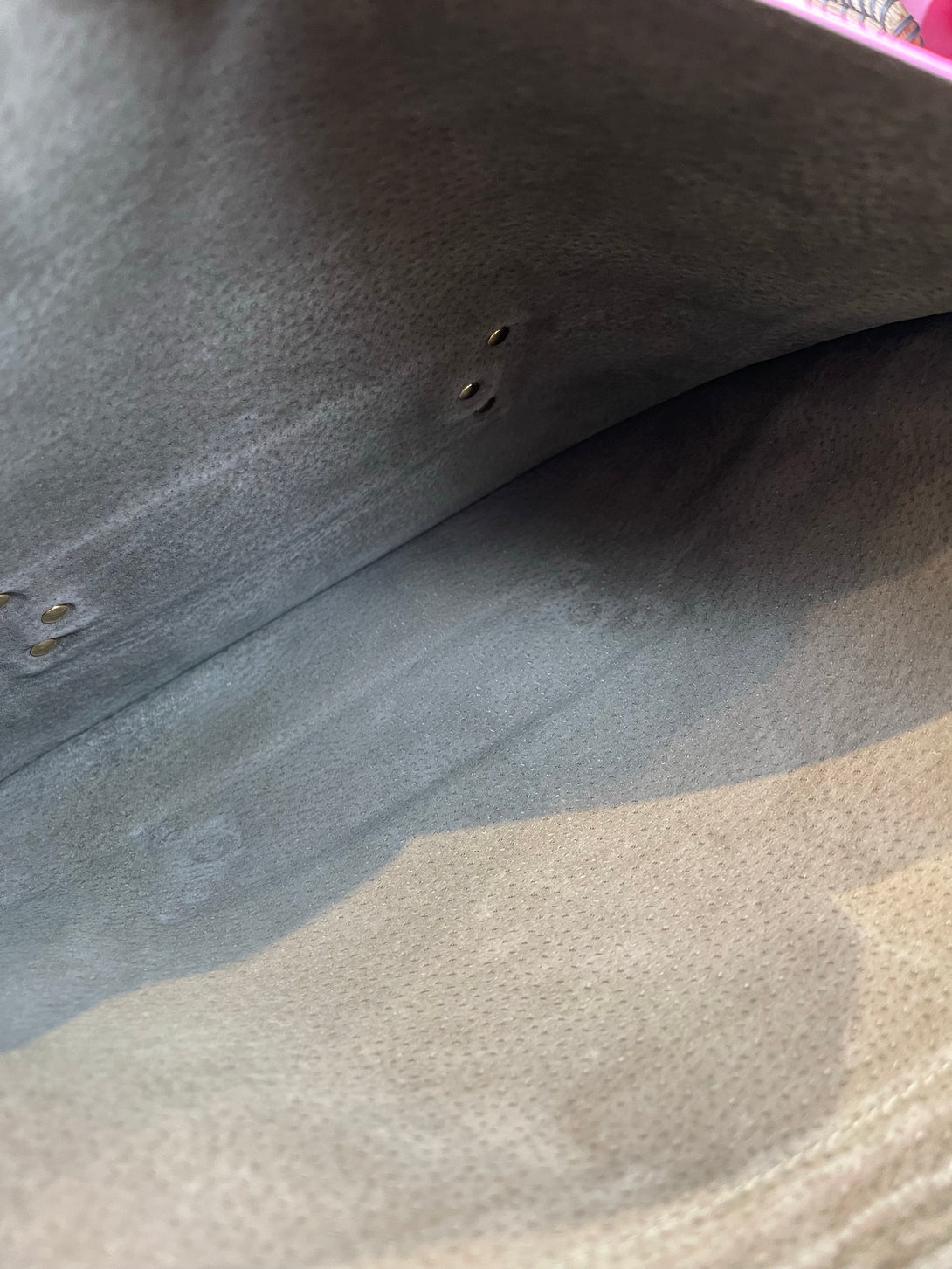 Good: Items show more prominent wear such as noticeable discoloration, stains and snags to fabric. May have worn corners and handles, tarnishing to hardware and creasing to leather. Pen or make up marks may be visible in the interior of the bag.