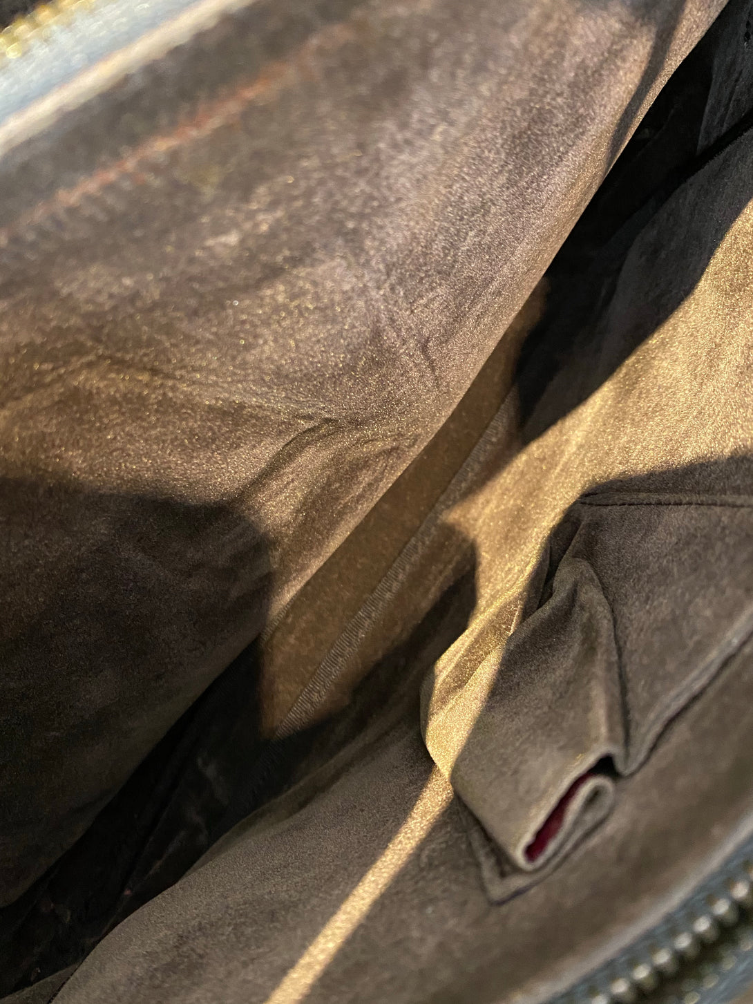 Good: Items show more prominent wear such as noticeable discoloration, stains and snags to fabric. May have worn corners and handles, tarnishing to hardware and creasing to leather. Pen or make up marks may be visible in the interior of the bag.