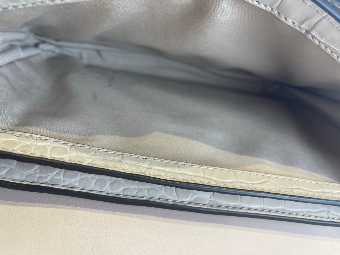Good: Items show more prominent wear such as noticeable discoloration, stains and snags to fabric. May have worn corners and handles, tarnishing to hardware and creasing to leather. Pen or make up marks may be visible in the interior of the bag.
